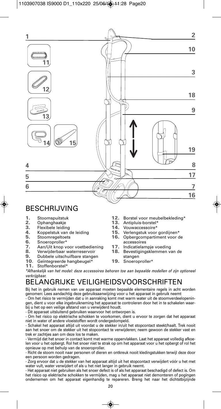 17. Voyant d’alimentation au pied 8. Réservoir d’eau amovible 18. Clips de fixation des mats 9. Double pôles télescopiques 19. Enrouleur de cordon* 10. Cintre intégré* *Suivant le modèle : ces accessoires sont spécifiques à certains modèles ou disponibles en option.