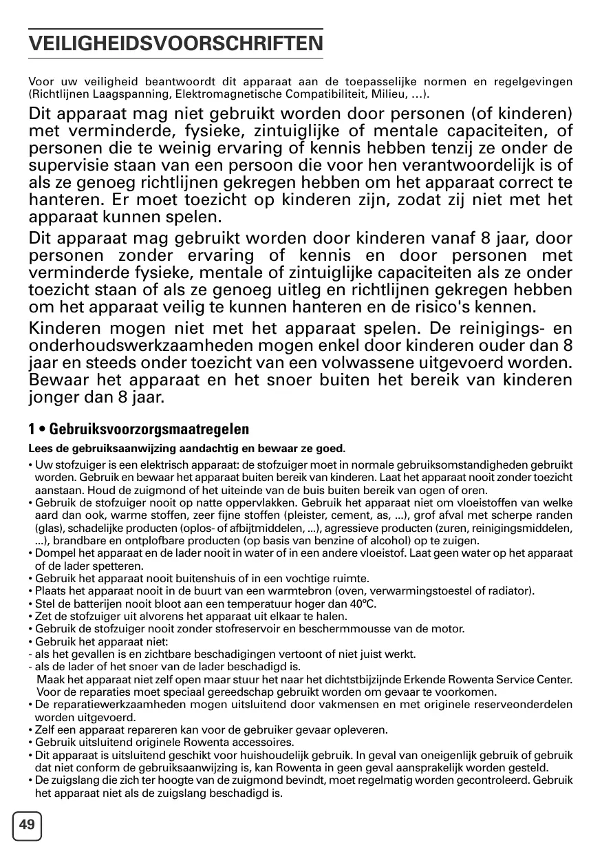 - Dit apparaat is uitsluitend geschikt voor huishoudelijk gebruik. In geval van oneigenlijk gebruik of gebruik dat niet conform de gebruiksaanwijzing is, kan Rowenta in geen geval aansprakelijk worden gesteld.