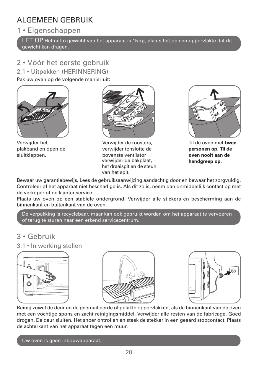 Bewaar uw garantiebewijs. Lees de gebruiksaanwijzing aandachtig door en bewaar het zorgvuldig. Controleer of het apparaat niet beschadigd is. Als dit zo is, neem dan onmiddellijk contact op met de verkoper of de klantenservice. Plaats uw oven op een stabiele ondergrond. Verwijder alle stickers en bescherming aan de binnenkant en buitenkant van de oven. De verpakking is recyclebaar, maar kan ook gebruikt worden om het apparaat te vervoeren of terug te sturen naar een erkend servicecentrum.