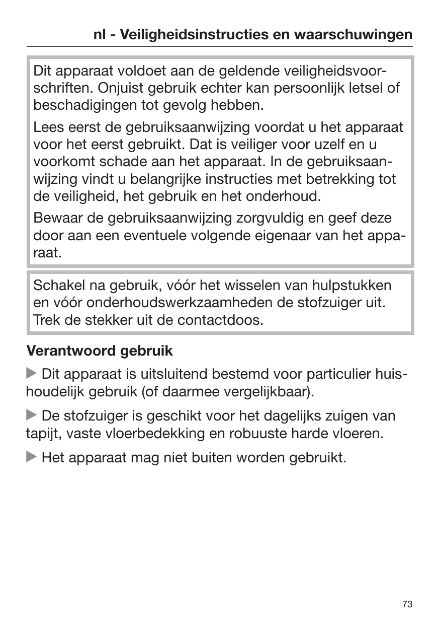 N'aspirez pas de produits ni de gaz inflammables ou explosifs. N'utilisez pas l'aspirateur dans des locaux dans lesquels sont stockés ces produits. Lorsque vous aspirez avec le tube télescopique, évitez de l'approcher de votre tête. Accessoires N'introduisez pas vos doigts dans l'électrobrosse ou la turbobrosse quand celles-ci sont en marche ! Lorsque vous passez l'aspirateur avec la poignée pour flexible sans accessoire, veillez à ne pas l'abîmer. N'utilisez que des sacs à poussière, des filtres et des accessoires portant le logo "Original Miele". Le fabricant ne peut garantir votre sécurité que dans ces conditions. Miele ne peut pas être tenu pour responsable pour les dommages qui résulteraient d'une mauvaise utilisation et qui iraient à l'encontre des consignes de sécurité.