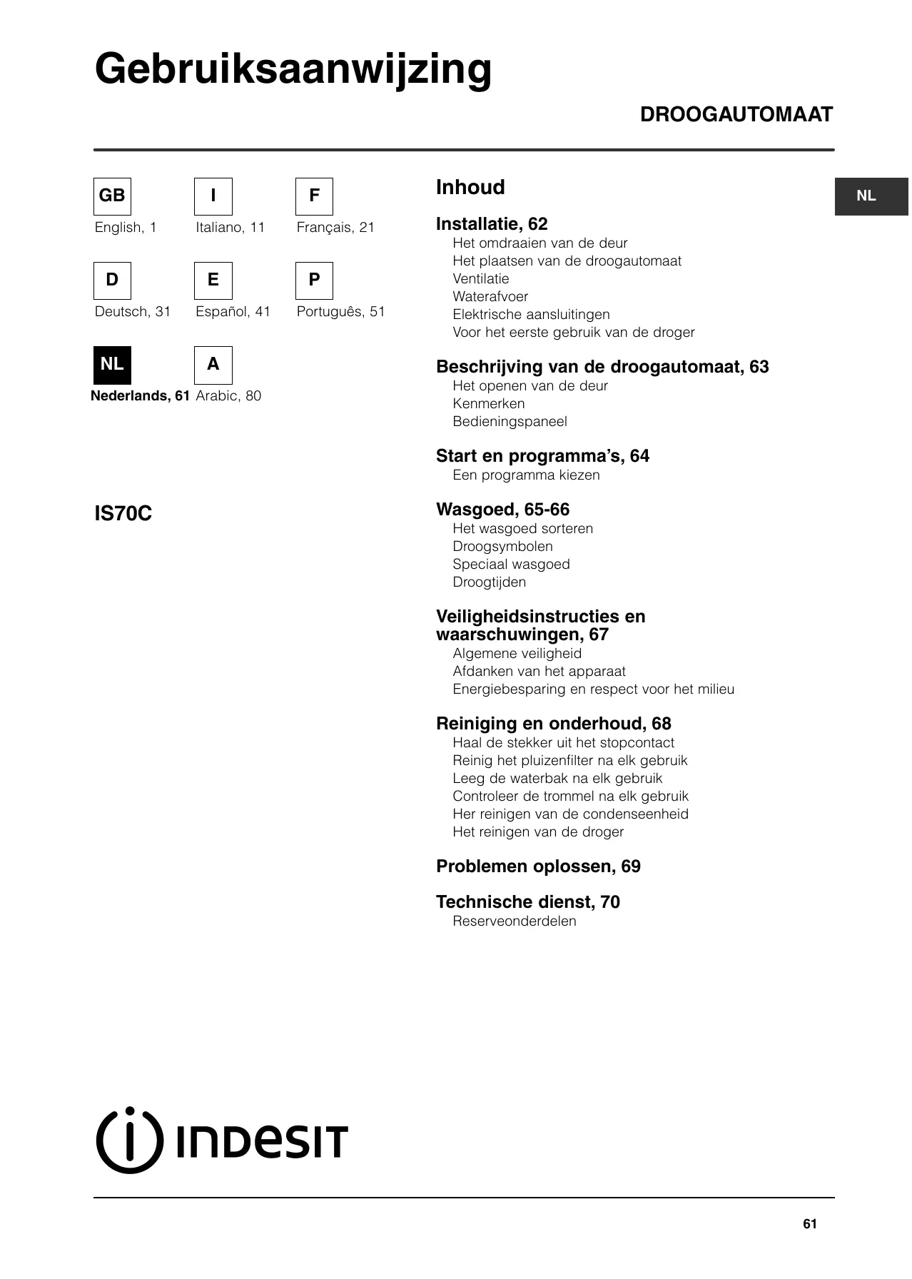 IS70C - Wasdroger INDESIT - Gratis gebruiksaanwijzing en handleiding
