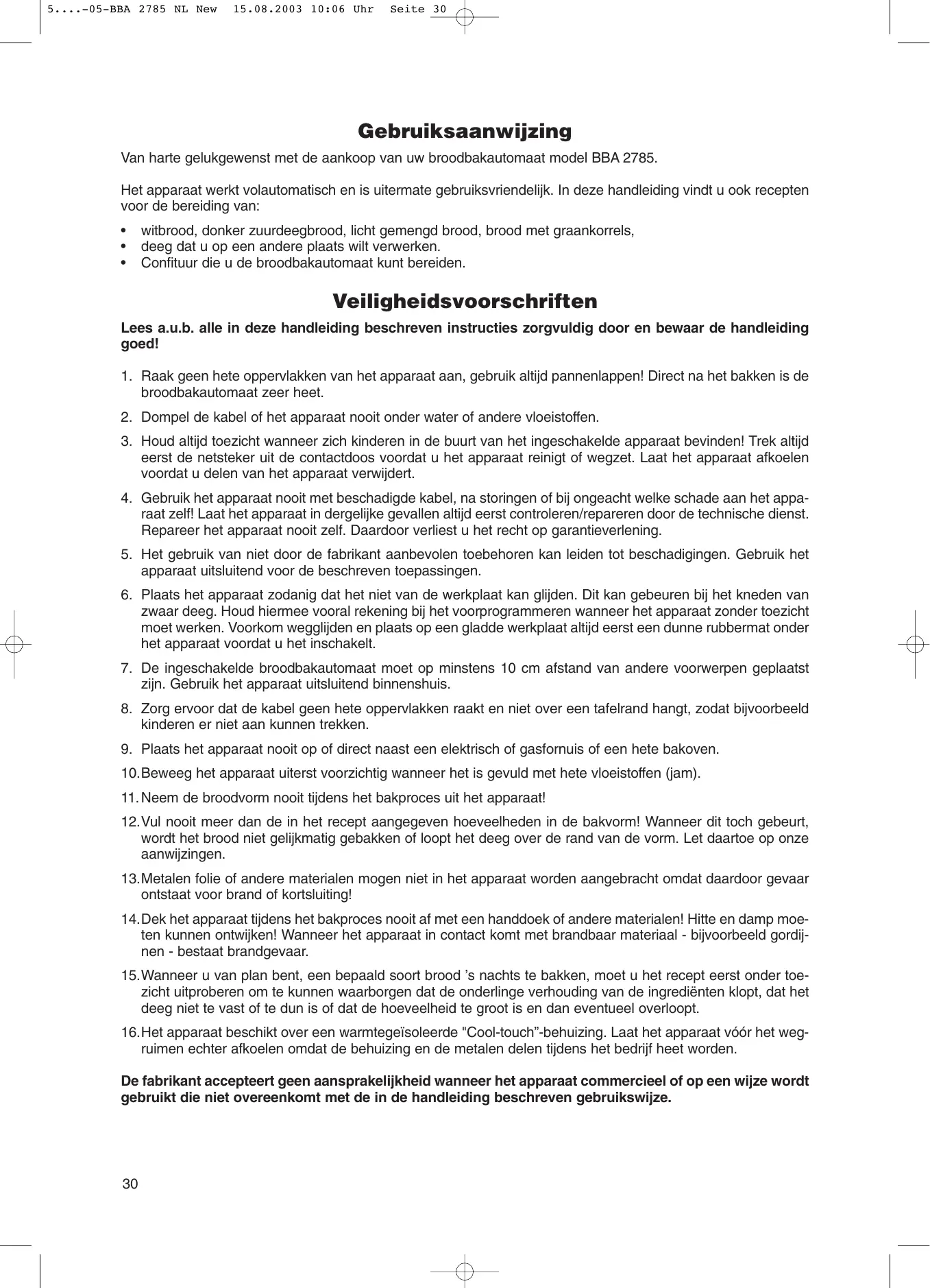 Veiligheidsvoorschriften Lees a.u.b. alle in deze handleiding beschreven instructies zorgvuldig door en bewaar de handleiding goed! 1. Raak geen hete oppervlakken van het apparaat aan, gebruik altijd pannenlappen! Direct na het bakken is de broodbakautomaat zeer heet. 2. Dompel de kabel of het apparaat nooit onder water of andere vloeistoffen. 3. Houd altijd toezicht wanneer zich kinderen in de buurt van het ingeschakelde apparaat bevinden! Trek altijd eerst de netsteker uit de contactdoos voordat u het apparaat reinigt of wegzet. Laat het apparaat afkoelen voordat u delen van het apparaat verwijdert. 4. Gebruik het apparaat nooit met beschadigde kabel, na storingen of bij ongeacht welke schade aan het apparaat zelf! Laat het apparaat in dergelijke gevallen altijd eerst controleren/repareren door de technische dienst. Repareer het apparaat nooit zelf. Daardoor verliest u het recht op garantieverlening. 5. Het gebruik van niet door de fabrikant aanbevolen toebehoren kan leiden tot beschadigingen. Gebruik het apparaat uitsluitend voor de beschreven toepassingen. 6. Plaats het apparaat zodanig dat het niet van de werkplaat kan glijden. Dit kan gebeuren bij het kneden van zwaar deeg. Houd hiermee vooral rekening bij het voorprogrammeren wanneer het apparaat zonder toezicht moet werken. Voorkom wegglijden en plaats op een gladde werkplaat altijd eerst een dunne rubbermat onder het apparaat voordat u het inschakelt. 7. De ingeschakelde broodbakautomaat moet op minstens 10 cm afstand van andere voorwerpen geplaatst zijn. Gebruik het apparaat uitsluitend binnenshuis. 8. Zorg ervoor dat de kabel geen hete oppervlakken raakt en niet over een tafelrand hangt, zodat bijvoorbeeld kinderen er niet aan kunnen trekken. 9. Plaats het apparaat nooit op of direct naast een elektrisch of gasfornuis of een hete bakoven. 10.Beweeg het apparaat uiterst voorzichtig wanneer het is gevuld met hete vloeistoffen (jam). 11. Neem de broodvorm nooit tijdens het bakproces uit het apparaat! 12.Vul nooit meer dan de in het recept aangegeven hoeveelheden in de bakvorm! Wanneer dit toch gebeurt, wordt het brood niet gelijkmatig gebakken of loopt het deeg over de rand van de vorm. Let daartoe op onze aanwijzingen. 13.Metalen folie of andere materialen mogen niet in het apparaat worden aangebracht omdat daardoor gevaar ontstaat voor brand of kortsluiting! 14.Dek het apparaat tijdens het bakproces nooit af met een handdoek of andere materialen! Hitte en damp moeten kunnen ontwijken! Wanneer het apparaat in contact komt met brandbaar materiaal - bijvoorbeeld gordijnen - bestaat brandgevaar. 15.Wanneer u van plan bent, een bepaald soort brood ’s nachts te bakken, moet u het recept eerst onder toezicht uitproberen om te kunnen waarborgen dat de onderlinge verhouding van de ingrediënten klopt, dat het deeg niet te vast of te dun is of dat de hoeveelheid te groot is en dan eventueel overloopt. 16.Het apparaat beschikt over een warmtegeïsoleerde "Cool-touch”-behuizing. Laat het apparaat vóór het wegruimen echter afkoelen omdat de behuizing en de metalen delen tijdens het bedrijf heet worden. De fabrikant accepteert geen aansprakelijkheid wanneer het apparaat commercieel of op een wijze wordt gebruikt die niet overeenkomt met de in de handleiding beschreven gebruikswijze.