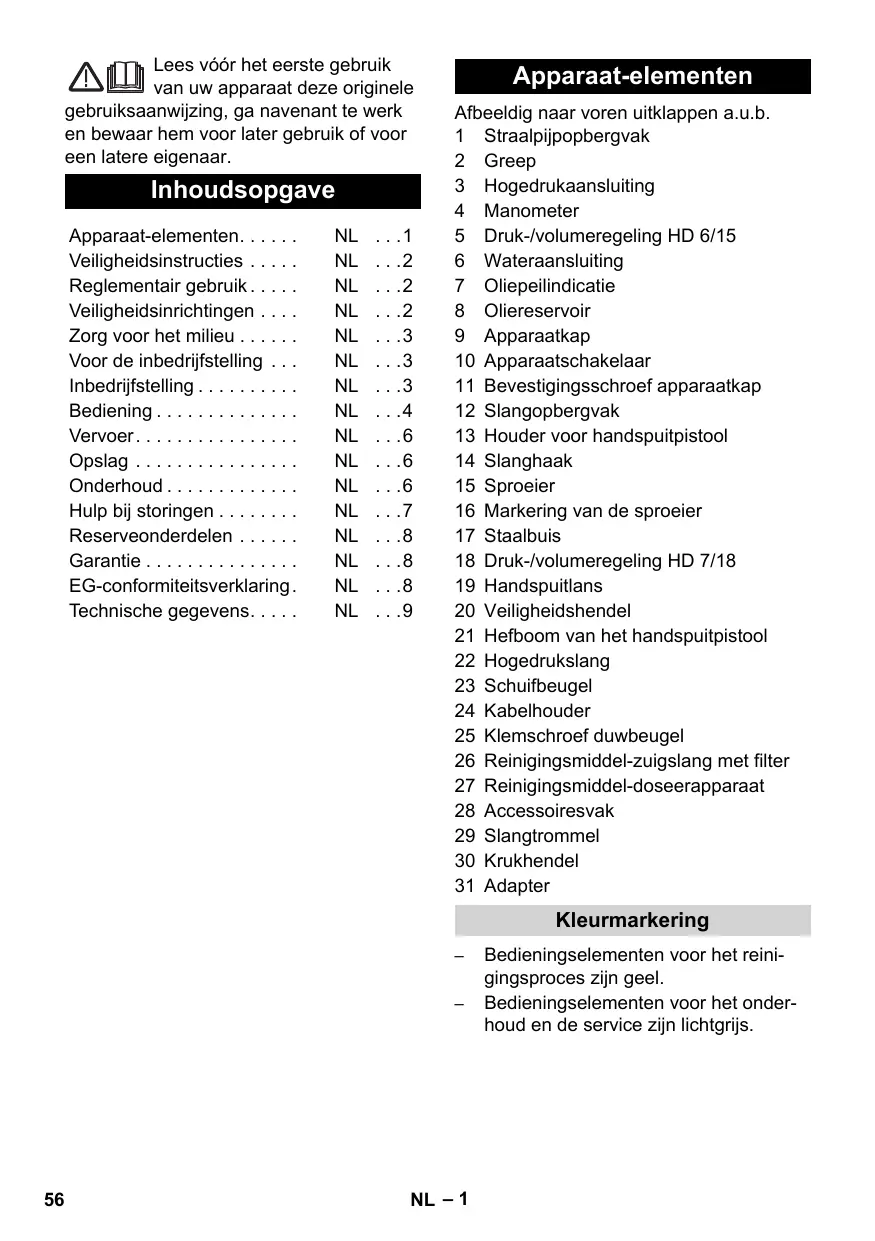 Apparaat-elementen Afbeeldig naar voren uitklappen a.u.b. 1 Straalpijpopbergvak 2 Greep 3 Hogedrukaansluiting 4 Manometer 5 Druk-/volumeregeling HD 6/15 6 Wateraansluiting 7 Oliepeilindicatie 8 Oliereservoir 9 Apparaatkap 10 Apparaatschakelaar 11 Bevestigingsschroef apparaatkap 12 Slangopbergvak 13 Houder voor handspuitpistool 14 Slanghaak 15 Sproeier 16 Markering van de sproeier 17 Staalbuis 18 Druk-/volumeregeling HD 7/18 19 Handspuitlans 20 Veiligheidshendel 21 Hefboom van het handspuitpistool 22 Hogedrukslang 23 Schuifbeugel 24 Kabelhouder 25 Klemschroef duwbeugel 26 Reinigingsmiddel-zuigslang met filter 27 Reinigingsmiddel-doseerapparaat 28 Accessoiresvak 29 Slangtrommel 30 Krukhendel 31 Adapter Kleurmarkering