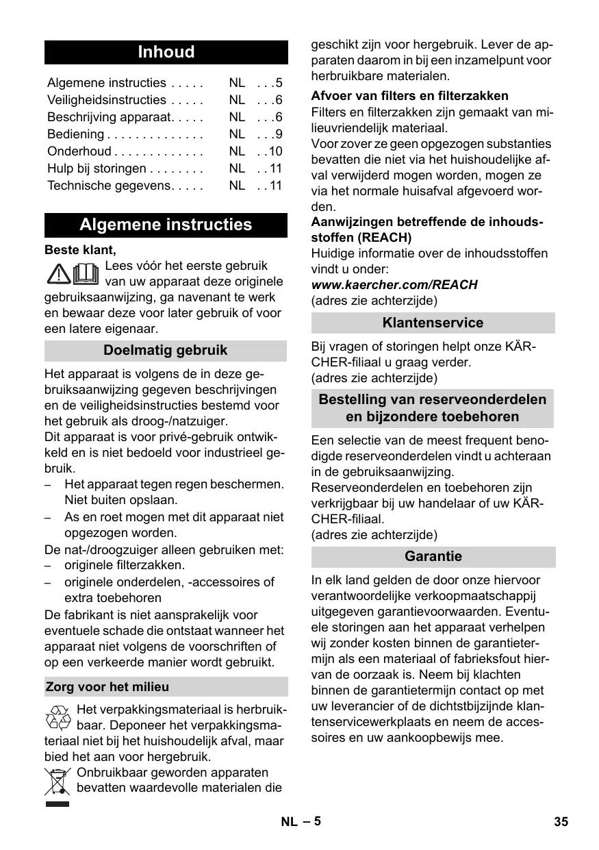 Elimination du filtre et du sac du filtre Le filtre et le sac du filtre sont fabriqués en matériaux recyclables. S'ils ne contiennent aucune substance aspirée dont l'élimination est interdite dans les déchets ménagers, vous pouvez les jeter dans les déchets ordinaires. Instructions relatives aux ingrédients (REACH) Les informations actuelles relatives aux ingrédients se trouvent sous : www.kaercher.com/REACH (Adresse au dos)
