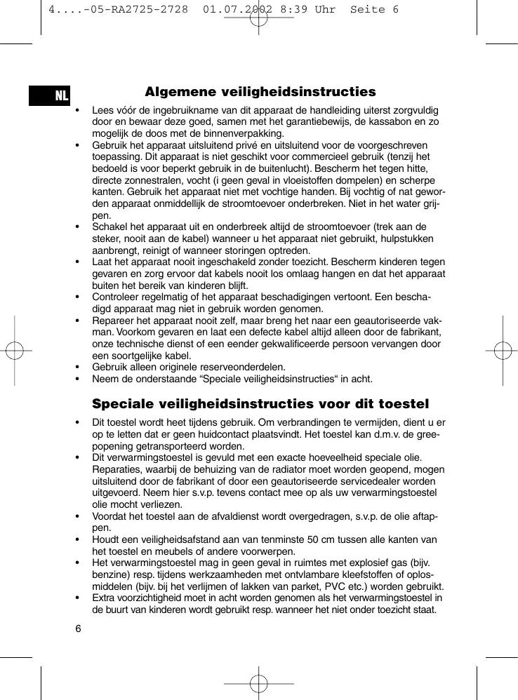 Geen voorwerpen in het verwarmingstoestel stoppen. Let op een veilige afstand tussen het stroomsnoer en de verwarmingsbehuizing. Om oververhitting van de radiator te voorkomen, dienen luchtinlaat en –uitlaat te worden vrijgehouden. Hang nooit objecten voor of boven het verwarmingstoestel. De verwarming niet buiten gebruiken. Dit verwarmingstoestel is niet geschikt voor gebruik in badkamers, wasruimten of andere soortgelijke ruimte. Zet de verwarming nooit op plekken waar het in een badkuip of een ander water zou kunnen vallen. Het verwarmingstoestel niet afdekken. Het verwarmingstoestel niet direct onder een contactdoos plaatsen. Het verwarmingstoestel alleen rechtopstaand gebruiken. Als het verwarmingstoestel om mocht vallen, moet meteen de stekker uit het stopcontact worden gehaald. Het toestel dient vervolgens eerst af te koelen, voordat het weer rechtop mag worden gezet.