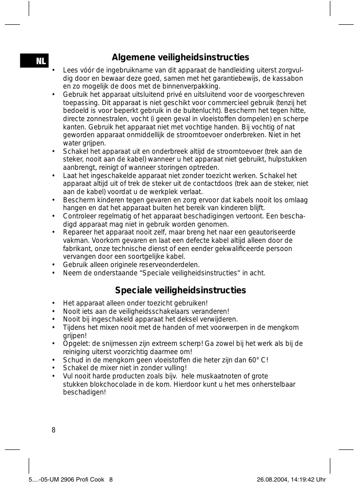 Het apparaat alleen onder toezicht gebruiken! Nooit iets aan de veiligheidsschakelaars veranderen! Nooit bij ingeschakeld apparaat het deksel verwijderen. Tijdens het mixen nooit met de handen of met voorwerpen in de mengkom grijpen! Opgelet: de snijmessen zijn extreem scherp! Ga zowel bij het werk als bij de reiniging uiterst voorzichtig daarmee om! Schud in de mengkom geen vloeistoffen die heter zijn dan 60° C! Schakel de mixer niet in zonder vulling! Vul nooit harde producten zoals bijv. hele muskaatnoten of grote stukken blokchocolade in de kom. Hierdoor kunt u het mes onherstelbaar beschadigen!