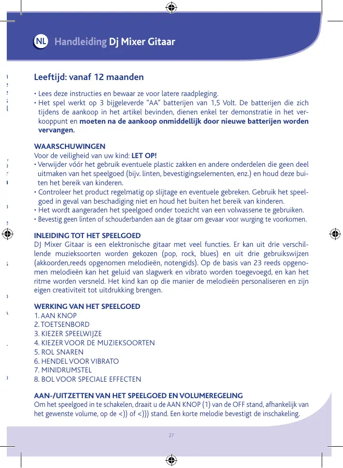 • Se aconseja utilizar el juguete bajo la supervisión de un adulto. • No fijar lazos ni cintas a la guitarra para evitar riesgos de estrangulamiento. INTRODUCCIÓN AL JUGUETE Dj Mixer Guitarra es una guitarra eléctrica con muchas funciones. Se pueden seleccionar tres géneros musicales diferentes (Pop, Rock, Blues) y elegir entre tres modalidades de uso (acordes, melodías grabadas, notas-guía). Sobre la base de las 23 melodías grabadas además, se puede añadir el sonido de las percusiones y de la vibración, y acelerar el ritmo de la música. De esta forma el niño puede personalizar las melodías y expresar su propia creatividad. FUNCIONAMIENTO DEL JUGUETE 1. SELECTOR DE ENCENDIDO 2. TECLADO 3. SELECTOR DE LA MODALIDAD DE JUEGO 4. SELECTOR DEL GÉNERO MUSICAL 5. RODILLO CUERDAS 6. PALANCA PARA LA VIBRACIÓN 7. MINI BATERÍA Se puede seleccionar una de las tres modalidades diferentes de juego girando el SELECTOR MODALIDAD DE JUEGO (3) y colocándolo sobre uno de los siguientes símbolos. Una breve melodía confirma la selección. • Modalidad acordes: apretando los cinco botones del teclado (2) se escuchan cinco acordes diferentes. • Modalidad melodías grabadas: apretando los cinco botones del teclado (2) se escuchan 15 melodías diferentes de tres estilos musicales (que se pueden seleccionar siguiendo las instrucciones del capítulo “Géneros musicales”). Durante la reproducción de las melodías también se pueden añadir voces de animales apretando de nuevo uno de los cinco botones de colores (2) según el animal deseado. • Modalidad notas guía: cuando se selecciona esta modalidad de juego, el teclado (2) se ilumina con un juego de luces que, pasados unos instantes, se detiene para señalar el botón de inicio de una de las melodías grabadas. Apretando uno a uno los botones que se iluminan en secuencia, el niño escuchará la pieza musical completa. Géneros musicales: En las modalidades “Melodías grabadas” y “Notas-guía” se puede seleccionar uno de los tres géneros musicales disponibles, girando el SELECTOR GÉNEROS MUSICALES (4) y colocándolo sobre uno de los siguientes símbolos. Una breve melodía confirmará la selección. Pop: apretando los botones del teclado (2) se escuchan cinco melodías pop. Rock: apretando los botones del teclado (2) se escuchan cinco melodías rock. Moviendo el “rodillo cuerdas” de la guitarra (5) hacia arriba y hacia abajo se activan tres sonidos diferentes. Si se activa la función cuerdas durante la reproducción de una melodía, la misma se interrumpe y es sustituida por el sonido de las cuerdas. ESTE PRODUCTO ES CONFORME A LA DIRECTIVA EU 2002/96/EC. El símbolo de la papelera borrada que se encuentra en el aparato indica que el producto, al final de su vida útil, deberá eliminarse separadamente de los desechos domésticos y por lo tanto deberá entregarse a un centro de recogida selectiva para aparatos eléctricos y electrónicos o al vendedor cuando compre un nuevo aparato similar. El usuario es responsable de entregar el aparato agotado a las estructuras apropiadas de recogida. La adecuada recogida selectiva para el envío sucesivo del aparato fuera de uso al reciclaje, al tratamiento y a la eliminación compatible con el ambiente, contribuye a evitar posibles efectos negativos en el ambiente y en la salud y favorece el reciclaje de los materiales de los que está compuesto el producto. Para informaciones más detalladas inherentes a los sistemas de recogida disponibles, diríjase al servicio local de eliminación de desechos, o a la tienda donde compró el aparato. CONFORMIDAD A LA DIRECTIVA EU 2006/66/EC El símbolo de la papelera tachada que se encuentra en las pilas o en la caja del producto indica que las pilas, al final de su vida útil, deberán eliminarse separadamente de los desechos domésticos y no tirarse a la basura, sino que deberán entregarse a un centro de recogida selectiva o al vendedor cuando compre pilas nuevas, recargables o no recargables, similares. Los símbolos químicos Hg, Cd, Pb, situados debajo de la papelera tachada indican el tipo de sustancia que contiene la pila: Hg = Mercurio, Cd = Cadmio, Pb = Plomo. El usuario es responsable de entregar las pilas agotadas a las estructuras apropiadas de recogida, para facilitar el tratamiento y el reciclado de las mismas. La adecuada recogida selectiva para el envío sucesivo de las pilas agotadas al reciclaje, al tratamiento y a la eliminación compatible con el ambiente, contribuye a evitar posibles efectos negativos 21 • En caso de que se utilicen baterías recargables, extraerlas del juguete antes de cargarlas y efectuar la recarga solo bajo la supervisión de un adulto. LIMPIEZA Y MANTENIMIENTO DEL JUGUETE • Limpiar el juguete utilizando un paño suave y seco para no dañar el circuito electrónico. • No sumergir el juguete en agua. • Proteger con cuidado el juguete del calor, polvo, arena y agua. • Le • H ti ko ve