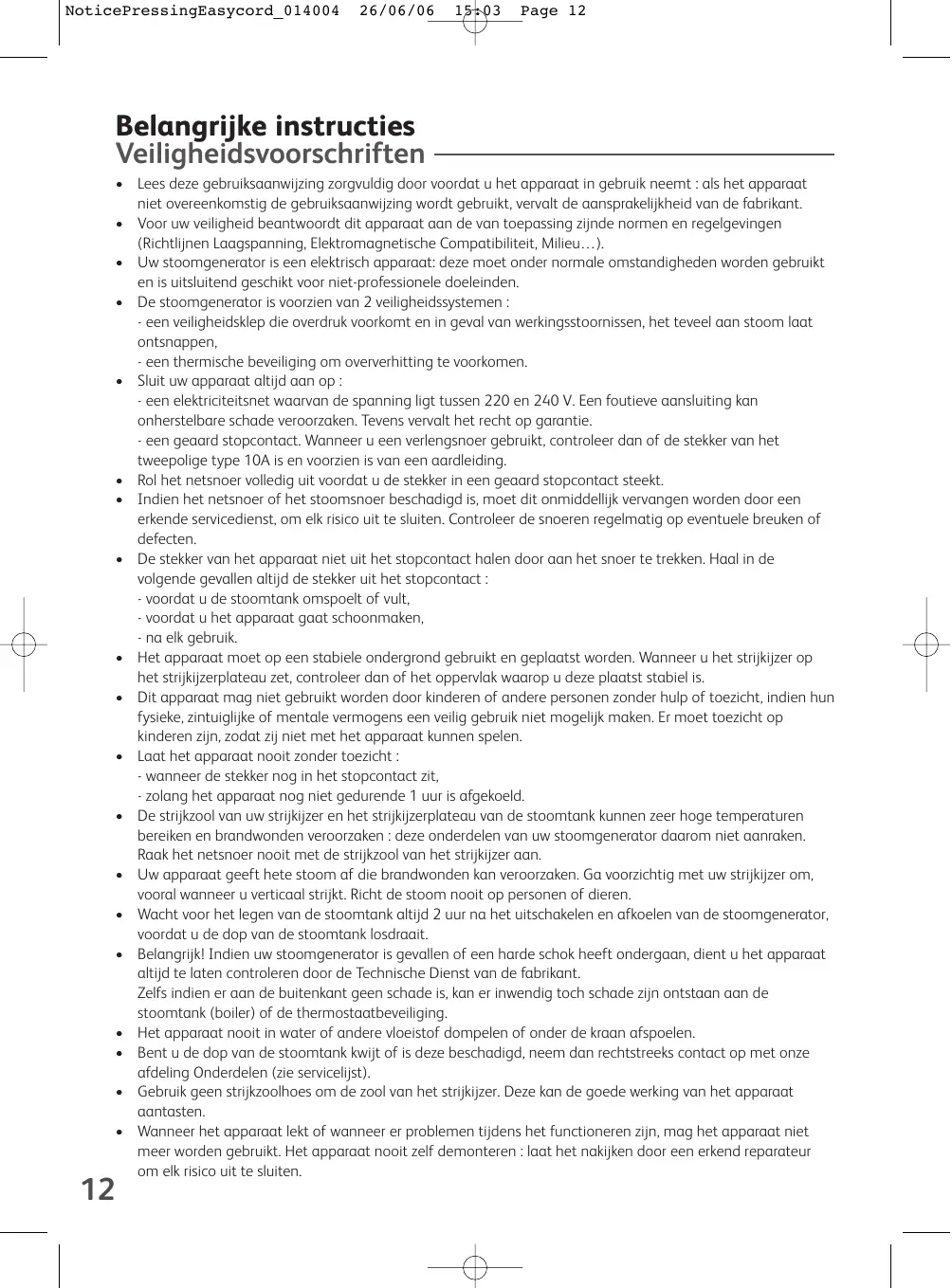 NoticePressingEasycord_014004 26/06/06 15:03 Page 12 Belangrijke instructies Veiligheidsvoorschriften