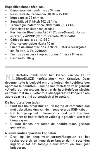 Acoplamiento de nuevos dispositivos de audio • Mantenga pulsado el botón de encendido/acoplamiento durante más de 4 segundos en el casco derecho hasta que se encienda una luz azul en el indicador y parpadee de manera rápida. • Active la función de búsqueda de Bluetooth en el dispositivo de audio • Seleccione “Creative WP-300 • Active la función Bluetooth en el dispositivo de audio que haya acoplado • Mantenga pulsado el botón de encendido/acoplamiento en el casco derecho hasta que la luz del indicador se ilumine en verde y parpadee lentamente. Los auriculares buscan de manera automática un dispositivo acoplado. Una vez se hayan conectado, el indicador se ilumina en azul y parpadea lentamente. En algunos casos, es posible que tenga que pulsar el botón de reproducción para establecer la conexión. • A partir de este momento, puede reproducir o pausar la