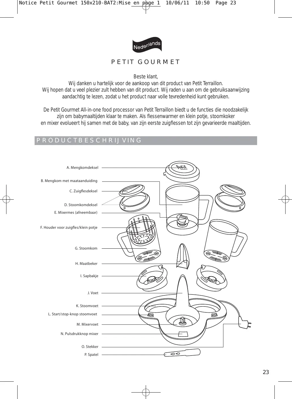 - Alle onderdelen behalve de voet van de Petit Gourmet (J, K en M) voor het eerste gebruik goed reinigen met zeepsop.