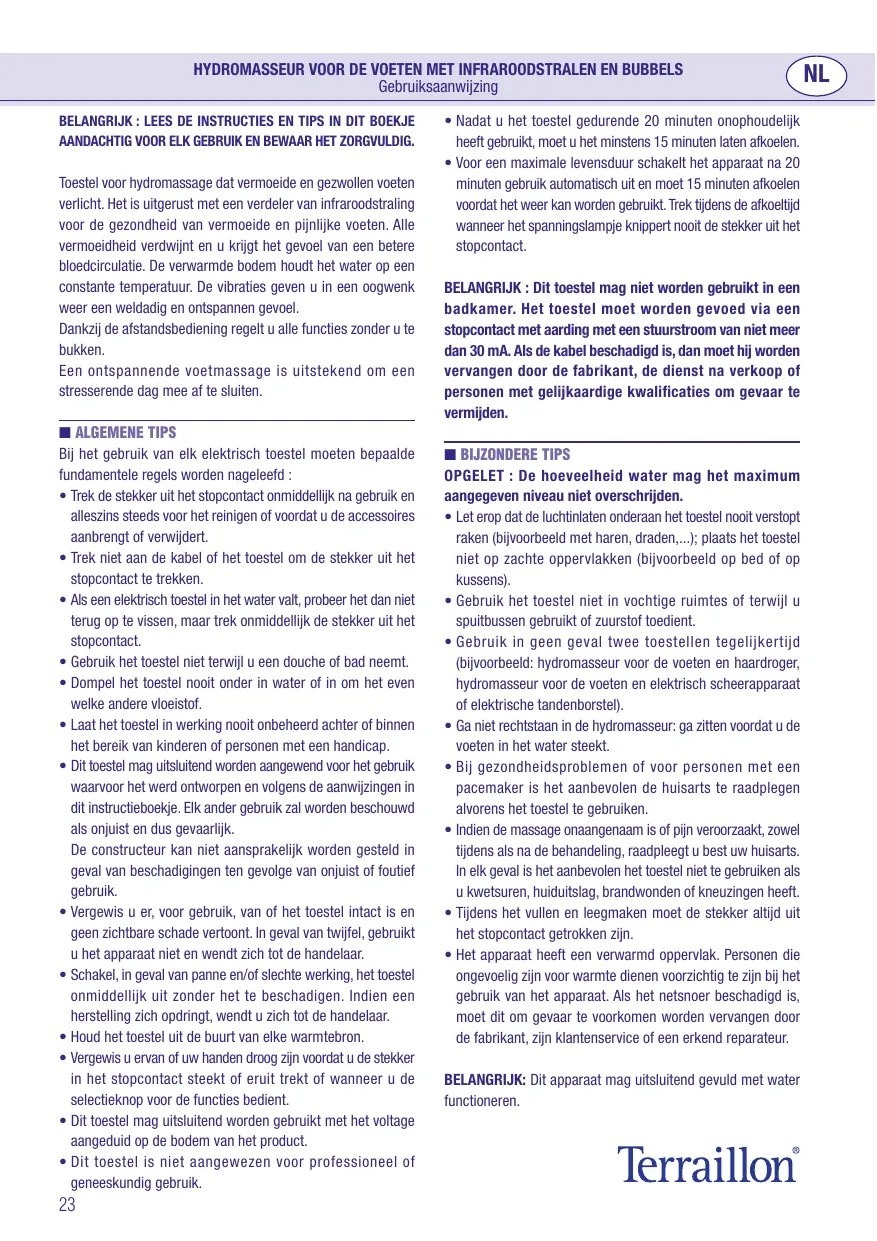 • Cet appareil n’est pas recommandé pour des utilisations à des fins professionnelles ou curatives. • Après avoir utilisé l’appareil sans interruption pendant une durée de 20 minutes, il est nécessaire de le laisser refroidir pendant au moins 15 minutes. • Pour optimiser la durée de vie du produit, l’alimentation s’arrête automatiquement après 20 minutes d’utilisation et ne se remet en marche qu’après 15 minutes d’attente. Ne débranchez pas l’appareil lorsque la diode d’alimentation clignote durant cette période d’attente. IMPORTANT : Cet appareil ne doit pas être utilisé dans une salle d’eau. L’appareil devrait être alimenté par l’intermédiaire d’un dispositif à courant différentiel résiduel ayant un courant de déclenchement n’excédant pas 30 mA. Si le câble est endommagé, il doit être remplacé par le fabricant, son service après-vente ou des personnes de qualifications similaires afin d’éviter le danger. ■ CONSEILS PARTICULIERS ATTENTION : La quantité d’eau ne doit jamais dépasser le niveau maximum indiqué. • Faites attention que les entrées d’air sur le fond de l’appareil ne soient jamais bouchées (comme par exemple : des cheveux, des fils,…) ; éviter de poser l’appareil sur des superficies molles (comme par exemple: lit ou coussins ). • Ne pas utiliser l’appareil dans des endroits humides ou durant l’utilisation d’aérosols ou administration d’oxygène. • N’utiliser en aucun cas deux appareils en même temps (par exemple : hydromassage plantaire et sèche-cheveux, hydromassage plantaire et rasoir électrique ou brosse à dents électrique). • Ne pas se mettre debout dans l’hydromasseur : s’asseoir avant de mettre les pieds dans l’eau. • En cas de problèmes de santé et pour les personnes munis de pacemaker, il est recommandé de consulter son médecin avant toute utilisation de l’appareil. • Dans le cas où le massage est désagréable ou s’il provoque des douleurs aussi bien durant qu’après le traitement, il est conseillé de consulter son médecin. Dans tous les cas, il est recommandé de ne pas utiliser l’appareil en présence de blessures, éruptions cutanées, brûlures ou contusions. • Durant les opérations de remplissage et de vidange, la prise doit toujours être débranchée de la prise de courant. IMPORTANT : Cet appareil ne doit fonctionner qu’avec de l’eau.