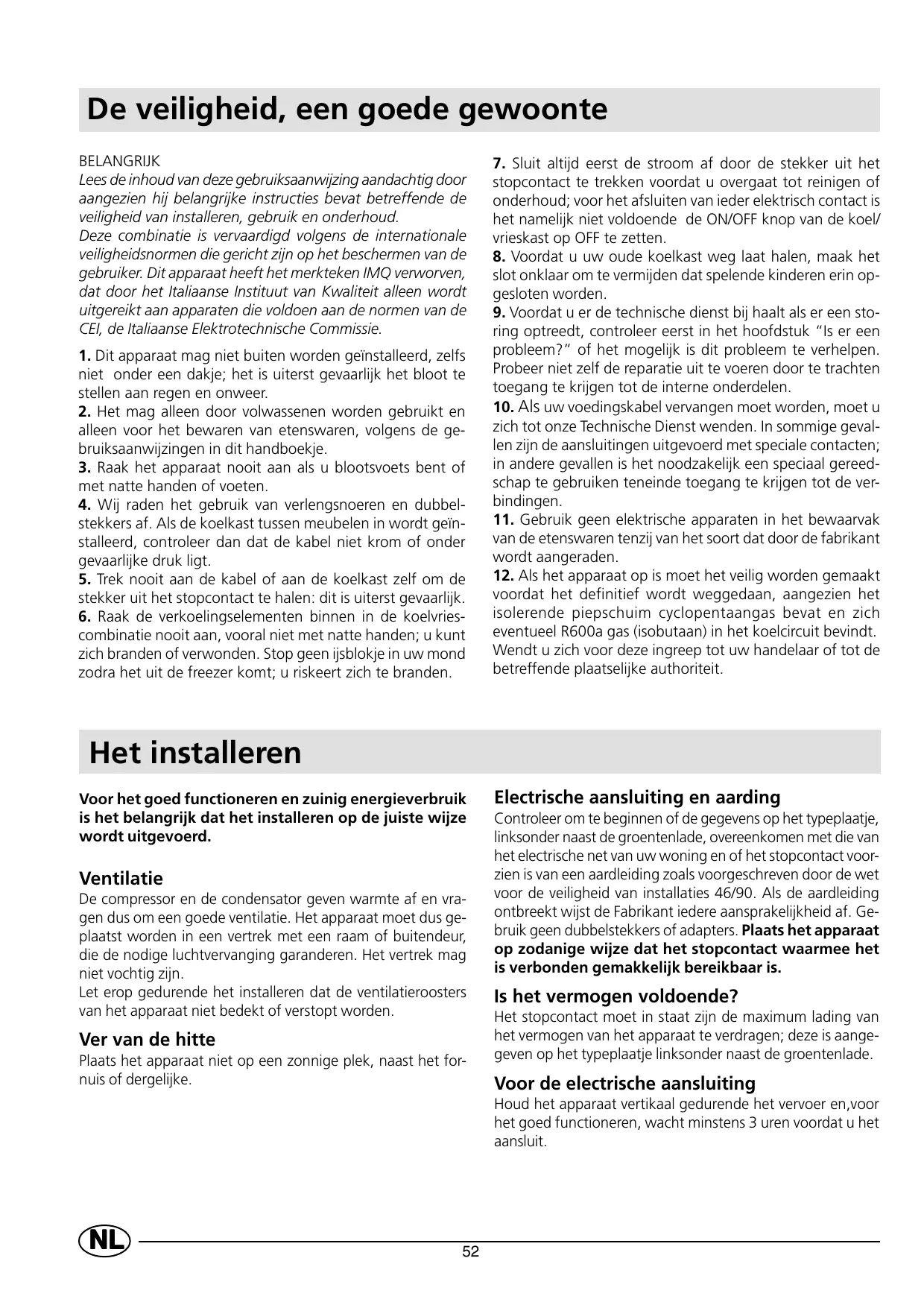 De veiligheid, een goede gewoonte BELANGRIJK Lees de inhoud van deze gebruiksaanwijzing aandachtig door aangezien hij belangrijke instructies bevat betreffende de veiligheid van installeren, gebruik en onderhoud. Deze combinatie is vervaardigd volgens de internationale veiligheidsnormen die gericht zijn op het beschermen van de gebruiker. Dit apparaat heeft het merkteken IMQ verworven, dat door het Italiaanse Instituut van Kwaliteit alleen wordt uitgereikt aan apparaten die voldoen aan de normen van de CEI, de Italiaanse Elektrotechnische Commissie.