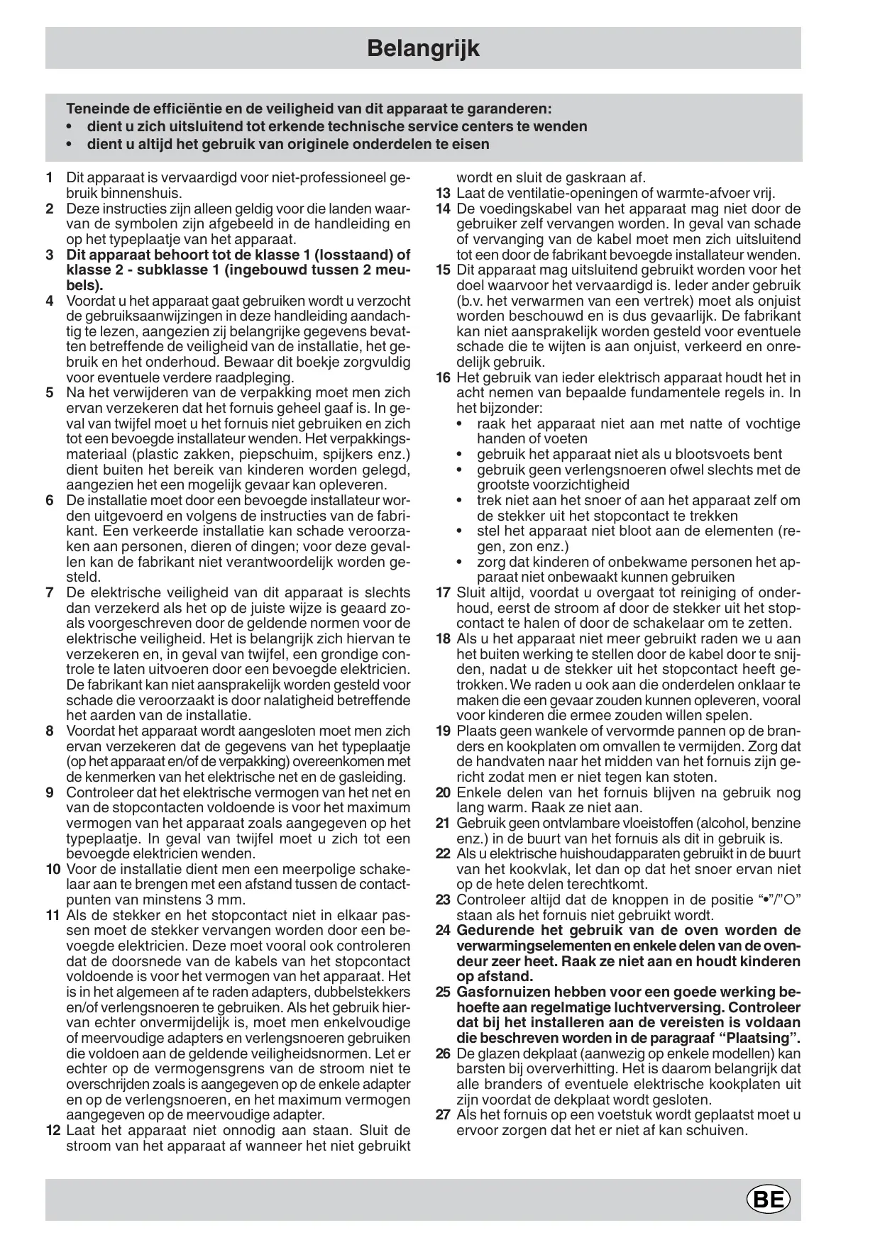 - dient u altijd het gebruik van originele onderdelen te eisen 1 Dit apparaat is vervaardigd voor niet-professioneel gebruik binnenshuis. 2 Deze instructies zijn alleen geldig voor die landen waarvan de symbolen zijn afgebeeld in de handleiding en op het typeplaatje van het apparaat. 3 Dit apparaat behoort tot de klasse 1 (losstaand) of klasse 2 - subklasse 1 (ingebouwd tussen 2 meubels). 4 Voordat u het apparaat gaat gebruiken wordt u verzocht de gebruiksaanwijzingen in deze handleiding aandachtig te lezen, aangezien zij belangrijke gegevens bevatten betreffende de veiligheid van de installatie, het gebruik en het onderhoud. Bewaar dit boekje zorgvuldig voor eventuele verdere raadpleging. 5 Na het verwijderen van de verpakking moet men zich ervan verzekeren dat het fornuis geheel gaaf is. In geval van twijfel moet u het fornuis niet gebruiken en zich tot een bevoegde installateur wenden. Het verpakkingsmateriaal (plastic zakken, piepschuim, spijkers enz.) dient buiten het bereik van kinderen worden gelegd, aangezien het een mogelijk gevaar kan opleveren. 6 De installatie moet door een bevoegde installateur worden uitgevoerd en volgens de instructies van de fabrikant. Een verkeerde installatie kan schade veroorzaken aan personen, dieren of dingen; voor deze gevallen kan de fabrikant niet verantwoordelijk worden gesteld. 7 De elektrische veiligheid van dit apparaat is slechts dan verzekerd als het op de juiste wijze is geaard zoals voorgeschreven door de geldende normen voor de elektrische veiligheid. Het is belangrijk zich hiervan te verzekeren en, in geval van twijfel, een grondige controle te laten uitvoeren door een bevoegde elektricien. De fabrikant kan niet aansprakelijk worden gesteld voor schade die veroorzaakt is door nalatigheid betreffende het aarden van de installatie. 8 Voordat het apparaat wordt aangesloten moet men zich ervan verzekeren dat de gegevens van het typeplaatje (op het apparaat en/of de verpakking) overeenkomen met de kenmerken van het elektrische net en de gasleiding. 9 Controleer dat het elektrische vermogen van het net en van de stopcontacten voldoende is voor het maximum vermogen van het apparaat zoals aangegeven op het typeplaatje. In geval van twijfel moet u zich tot een bevoegde elektricien wenden. 10 Voor de installatie dient men een meerpolige schakelaar aan te brengen met een afstand tussen de contactpunten van minstens 3 mm. 11 Als de stekker en het stopcontact niet in elkaar passen moet de stekker vervangen worden door een bevoegde elektricien. Deze moet vooral ook controleren dat de doorsnede van de kabels van het stopcontact voldoende is voor het vermogen van het apparaat. Het is in het algemeen af te raden adapters, dubbelstekkers en/of verlengsnoeren te gebruiken. Als het gebruik hiervan echter onvermijdelijk is, moet men enkelvoudige of meervoudige adapters en verlengsnoeren gebruiken die voldoen aan de geldende veiligheidsnormen. Let er echter op de vermogensgrens van de stroom niet te overschrijden zoals is aangegeven op de enkele adapter en op de verlengsnoeren, en het maximum vermogen aangegeven op de meervoudige adapter. 12 Laat het apparaat niet onnodig aan staan. Sluit de stroom van het apparaat af wanneer het niet gebruikt wordt en sluit de gaskraan af. 13 Laat de ventilatie-openingen of warmte-afvoer vrij. 14 De voedingskabel van het apparaat mag niet door de gebruiker zelf vervangen worden. In geval van schade of vervanging van de kabel moet men zich uitsluitend tot een door de fabrikant bevoegde installateur wenden. 15 Dit apparaat mag uitsluitend gebruikt worden voor het doel waarvoor het vervaardigd is. Ieder ander gebruik (b.v. het verwarmen van een vertrek) moet als onjuist worden beschouwd en is dus gevaarlijk. De fabrikant kan niet aansprakelijk worden gesteld voor eventuele schade die te wijten is aan onjuist, verkeerd en onredelijk gebruik. 16 Het gebruik van ieder elektrisch apparaat houdt het in acht nemen van bepaalde fundamentele regels in. In het bijzonder: