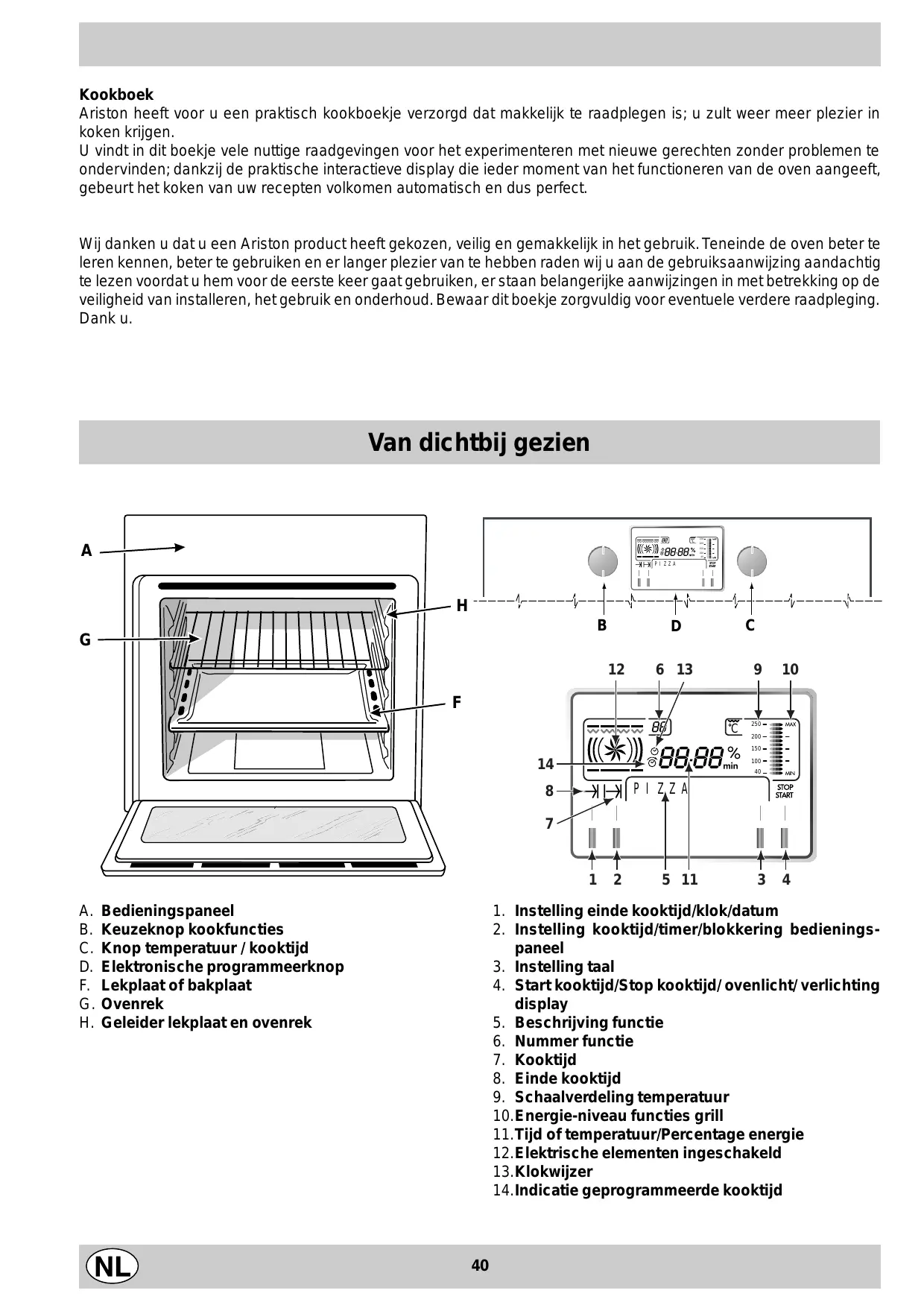 Wij danken u dat u een Ariston product heeft gekozen, veilig en gemakkelijk in het gebruik. Teneinde de oven beter te leren kennen, beter te gebruiken en er langer plezier van te hebben raden wij u aan de gebruiksaanwijzing aandachtig te lezen voordat u hem voor de eerste keer gaat gebruiken, er staan belangerijke aanwijzingen in met betrekking op de veiligheid van installeren, het gebruik en onderhoud. Bewaar dit boekje zorgvuldig voor eventuele verdere raadpleging. Dank u.