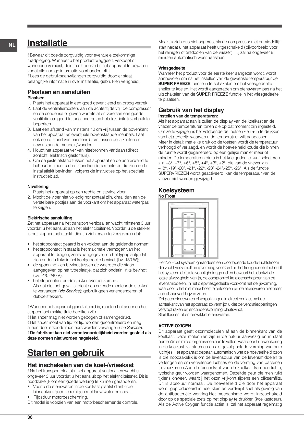 Wanneer het product voor de eerste keer aangezet worden, worden aanbevolen om na het instellen van de gewenste temperatuur de SUPER FREEZE functie in te schakenen om het vriesgedeelte sneller te koelen. Het worden aangeraden om etenswaren pas na het uitschakenen van de SUPER FREEZE functie in het vriesgedeelte te plaatsen.