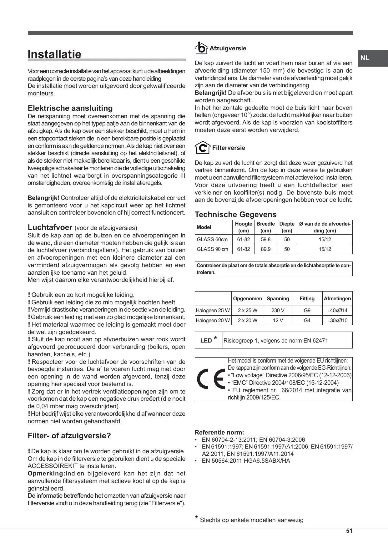 - Não acender a luz do exaustor a menos que seja necessário para iluminar a área de confecção. Installatie Voor een correcte installatie van het apparaat kunt u de afbeeldingen raadplegen in de eerste pagina’s van deze handleiding. De installatie moet worden uitgevoerd door gekwalificeerde monteurs. Elektrische aansluiting De netspanning moet overeenkomen met de spanning die staat aangegeven op het typeplaatje aan de binnenkant van de afzuigkap. Als de kap over een stekker beschikt, moet u hem in een stopcontact steken die in een bereikbare positie is geplaatst en conform is aan de geldende normen. Als de kap niet over een stekker beschikt (directe aansluiting op het elektriciteitsnet), of als de stekker niet makkelijk bereikbaar is, dient u een geschikte tweepolige schakelaar te monteren die de volledige uitschakeling van het lichtnet waarborgt in overspanningscategorie III omstandigheden, overeenkomstig de installatieregels. Belangrijk! Controleer altijd of de elektriciteitskabel correct is gemonteerd voor u het kapcircuit weer op het lichtnet aansluit en controleer bovendien of hij correct functioneert. Luchtafvoer (voor de afzuigversies) Sluit de kap aan op de buizen en de afvoeropeningen in de wand, die een diameter moeten hebben die gelijk is aan de luchtafvoer (verbindingsflens). Het gebruik van buizen en afvoeropeningen met een kleinere diameter zal een verminderd afzuigvermogen als gevolg hebben en een aanzienlijke toename van het geluid. Men wijst daarom elke verantwoordelijkheid hierbij af. ! Gebruik een zo kort mogelijke leiding. ! Gebruik een leiding die zo min mogelijk bochten heeft ! Vermijd drastische veranderingen in de sectie van de leiding. ! Gebruik een leiding met een zo glad mogelijke binnenkant. ! Het materiaal waarmee de leiding is gemaakt moet door de wet zijn goedgekeurd. ! Sluit de kap nooit aan op afvoerbuizen waar rook wordt afgevoerd geproduceerd door verbranding (boilers, open haarden, kachels, etc.). ! Respecteer voor de luchtafvoer de voorschriften van de bevoegde instanties. De af te voeren lucht mag niet door een opening in de wand worden afgevoerd, tenzij deze opening hier speciaal voor bestemd is. ! Zorg dat er in het vertrek ventilatieopeningen zijn om te voorkomen dat de kap een negatieve druk creëert (die nooit de 0,04 mbar mag overschrijden). ! Het bedrijf wijst elke verantwoordelijkheid af wanneer deze normen niet worden gehandhaafd. Filter- of afzuigversie? ! De kap is klaar om te worden gebruikt in de afzuigversie. Om de kap in de filterversie te gebruiken dient u de speciale ACCESSOIREKIT te installeren. Opmerking:Indien bijgeleverd kan het zijn dat het aanvullende filtersysteem met actieve kool al op de kap is geïnstalleerd. De informatie betreffende het omzetten van afzuigversie naar filterversie vindt u in deze handleiding terug (zie "Filterversie"). Afzuigversie De kap zuivert de lucht en voert hem naar buiten af via een afvoerleiding (diameter 150 mm) die bevestigd is aan de verbindingsflens. De diameter van de afvoerleiding moet gelijk zijn aan de diameter van de verbindingsring. Belangrijk! De afvoerbuis is niet bijgeleverd en moet apart worden aangeschaft. In het horizontale gedeelte moet de buis licht naar boven hellen (ongeveer 10°) zodat de lucht makkelijker naar buiten wordt afgevoerd. Als de kap is voorzien van koolstoffilters moeten deze eerst worden verwijderd. Filterversie De kap zuivert de lucht en zorgt dat deze weer gezuiverd het vertrek binnenkomt. Om de kap in deze versie te gebruiken moet u een aanvullend filtersysteem met actieve kool installeren. Voor deze uitvoering heeft u een luchtdeflector, een verkleiner en koolfilter(s) nodig. De bovenste buis moet aan de bovenzijde afvoeropeningen hebben voor de lucht. Technische Gegevens Hoogte Breedte Diepte Ø van de de afvoerlei(cm) (cm) (cm) ding (cm) Model GLASS 60cm 61-82