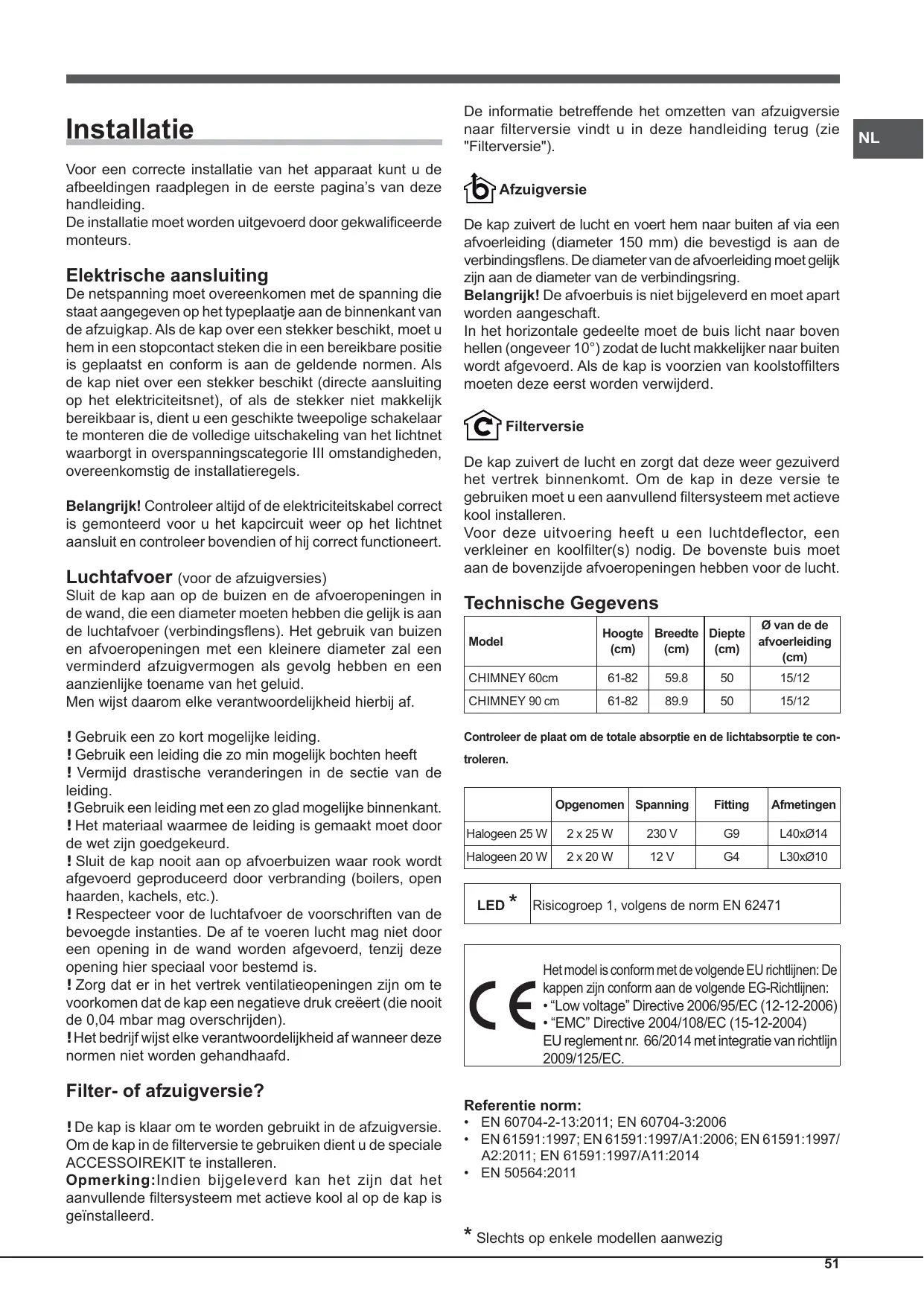 Installatie Voor een correcte installatie van het apparaat kunt u de afbeeldingen raadplegen in de eerste pagina’s van deze handleiding. De installatie moet worden uitgevoerd door gekwalificeerde monteurs. Elektrische aansluiting De netspanning moet overeenkomen met de spanning die staat aangegeven op het typeplaatje aan de binnenkant van de afzuigkap. Als de kap over een stekker beschikt, moet u hem in een stopcontact steken die in een bereikbare positie is geplaatst en conform is aan de geldende normen. Als de kap niet over een stekker beschikt (directe aansluiting op het elektriciteitsnet), of als de stekker niet makkelijk bereikbaar is, dient u een geschikte tweepolige schakelaar te monteren die de volledige uitschakeling van het lichtnet waarborgt in overspanningscategorie III omstandigheden, overeenkomstig de installatieregels. Belangrijk! Controleer altijd of de elektriciteitskabel correct is gemonteerd voor u het kapcircuit weer op het lichtnet aansluit en controleer bovendien of hij correct functioneert. Luchtafvoer (voor de afzuigversies) De informatie betreffende het omzetten van afzuigversie naar filterversie vindt u in deze handleiding terug (zie "Filterversie"). Afzuigversie De kap zuivert de lucht en voert hem naar buiten af via een afvoerleiding (diameter 150 mm) die bevestigd is aan de verbindingsflens. De diameter van de afvoerleiding moet gelijk zijn aan de diameter van de verbindingsring. Belangrijk! De afvoerbuis is niet bijgeleverd en moet apart worden aangeschaft. In het horizontale gedeelte moet de buis licht naar boven hellen (ongeveer 10°) zodat de lucht makkelijker naar buiten wordt afgevoerd. Als de kap is voorzien van koolstoffilters moeten deze eerst worden verwijderd. Filterversie De kap zuivert de lucht en zorgt dat deze weer gezuiverd het vertrek binnenkomt. Om de kap in deze versie te gebruiken moet u een aanvullend filtersysteem met actieve kool installeren. Voor deze uitvoering heeft u een luchtdeflector, een verkleiner en koolfilter(s) nodig. De bovenste buis moet aan de bovenzijde afvoeropeningen hebben voor de lucht. Sluit de kap aan op de buizen en de afvoeropeningen in de wand, die een diameter moeten hebben die gelijk is aan de luchtafvoer (verbindingsflens). Het gebruik van buizen en afvoeropeningen met een kleinere diameter zal een verminderd afzuigvermogen als gevolg hebben en een aanzienlijke toename van het geluid. Men wijst daarom elke verantwoordelijkheid hierbij af. Technische Gegevens ! Gebruik een zo kort mogelijke leiding. ! Gebruik een leiding die zo min mogelijk bochten heeft ! Vermijd drastische veranderingen in de sectie van de leiding. ! Gebruik een leiding met een zo glad mogelijke binnenkant. ! Het materiaal waarmee de leiding is gemaakt moet door de wet zijn goedgekeurd. ! Sluit de kap nooit aan op afvoerbuizen waar rook wordt afgevoerd geproduceerd door verbranding (boilers, open haarden, kachels, etc.). ! Respecteer voor de luchtafvoer de voorschriften van de bevoegde instanties. De af te voeren lucht mag niet door een opening in de wand worden afgevoerd, tenzij deze opening hier speciaal voor bestemd is. ! Zorg dat er in het vertrek ventilatieopeningen zijn om te voorkomen dat de kap een negatieve druk creëert (die nooit de 0,04 mbar mag overschrijden). ! Het bedrijf wijst elke verantwoordelijkheid af wanneer deze normen niet worden gehandhaafd. Controleer de plaat om de totale absorptie en de lichtabsorptie te con- Filter- of afzuigversie? ! De kap is klaar om te worden gebruikt in de afzuigversie. Om de kap in de filterversie te gebruiken dient u de speciale ACCESSOIREKIT te installeren. Opmerking:Indien bijgeleverd kan het zijn dat het aanvullende filtersysteem met actieve kool al op de kap is geïnstalleerd. Hoogte Breedte Diepte (cm) (cm) (cm) Model Ø van de de afvoerleiding (cm) CHIMNEY 60cm 61-82