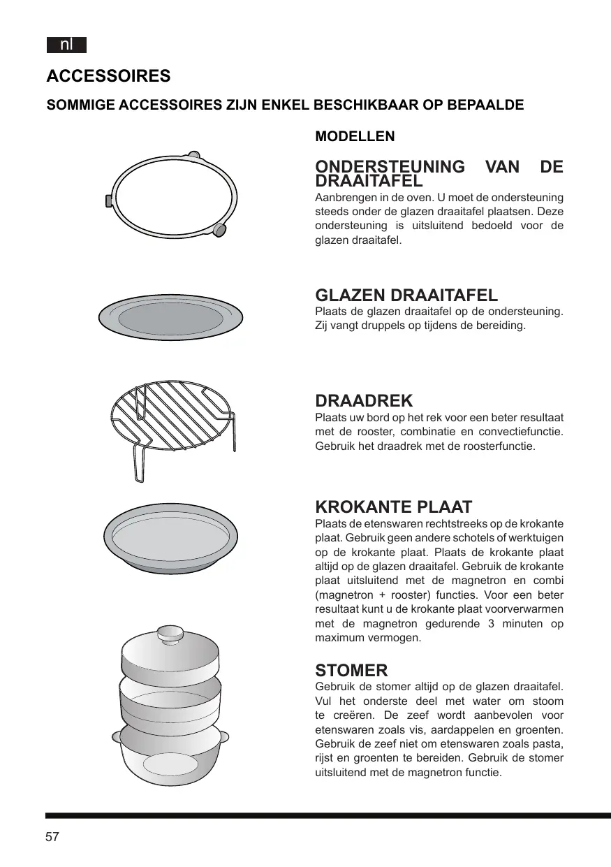 Gebruik de stomer altijd op de glazen draaitafel. Vul het onderste deel met water om stoom te creëren. De zeef wordt aanbevolen voor etenswaren zoals vis, aardappelen en groenten. Gebruik de zeef niet om etenswaren zoals pasta, rijst en groenten te bereiden. Gebruik de stomer uitsluitend met de magnetron functie.