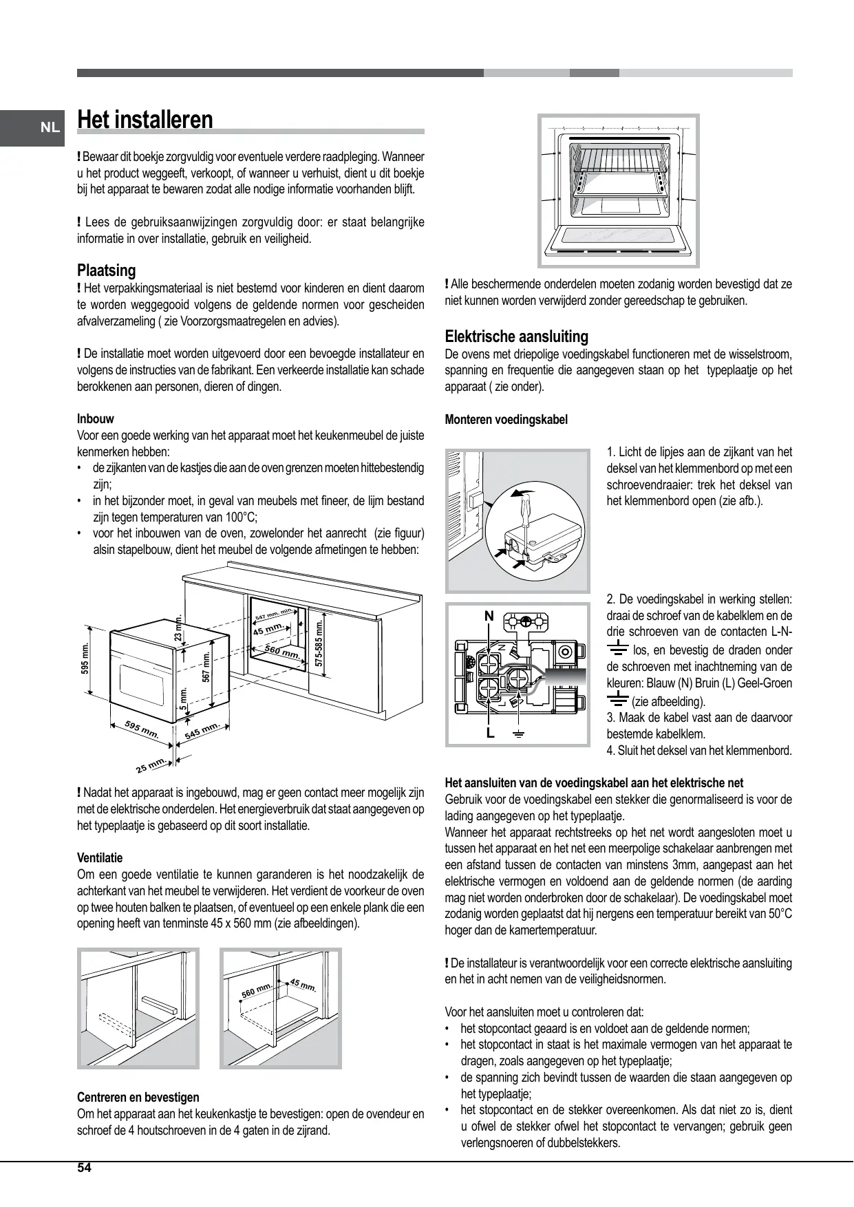 Het installeren ! Bewaar dit boekje zorgvuldig voor eventuele verdere raadpleging. Wanneer u het product weggeeft, verkoopt, of wanneer u verhuist, dient u dit boekje bij het apparaat te bewaren zodat alle nodige informatie voorhanden blijft. ! Lees de gebruiksaanwijzingen zorgvuldig door: er staat belangrijke informatie in over installatie, gebruik en veiligheid. Plaatsing ! Het verpakkingsmateriaal is niet bestemd voor kinderen en dient daarom te worden weggegooid volgens de geldende normen voor gescheiden afvalverzameling ( zie Voorzorgsmaatregelen en advies). ! Alle beschermende onderdelen moeten zodanig worden bevestigd dat ze niet kunnen worden verwijderd zonder gereedschap te gebruiken. ! De installatie moet worden uitgevoerd door een bevoegde installateur en volgens de instructies van de fabrikant. Een verkeerde installatie kan schade berokkenen aan personen, dieren of dingen. De ovens met driepolige voedingskabel functioneren met de wisselstroom, spanning en frequentie die aangegeven staan op het typeplaatje op het apparaat ( zie onder).