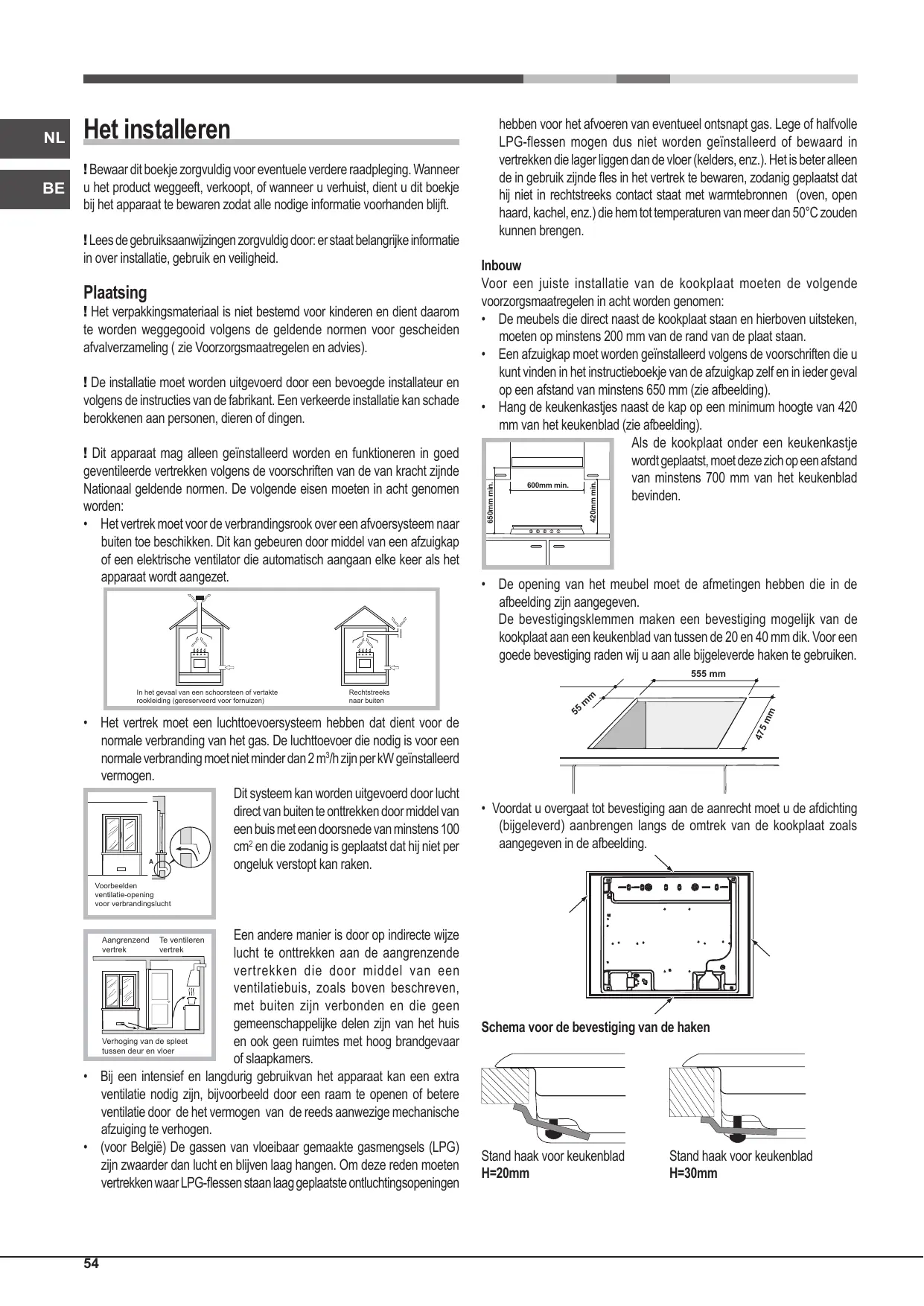 - Het vertrek moet voor de verbrandingsrook over een afvoersysteem naar buiten toe beschikken. Dit kan gebeuren door middel van een afzuigkap of een elektrische ventilator die automatisch aangaan elke keer als het apparaat wordt aangezet. Inbouw Voor een juiste installatie van de kookplaat moeten de volgende voorzorgsmaatregelen in acht worden genomen: