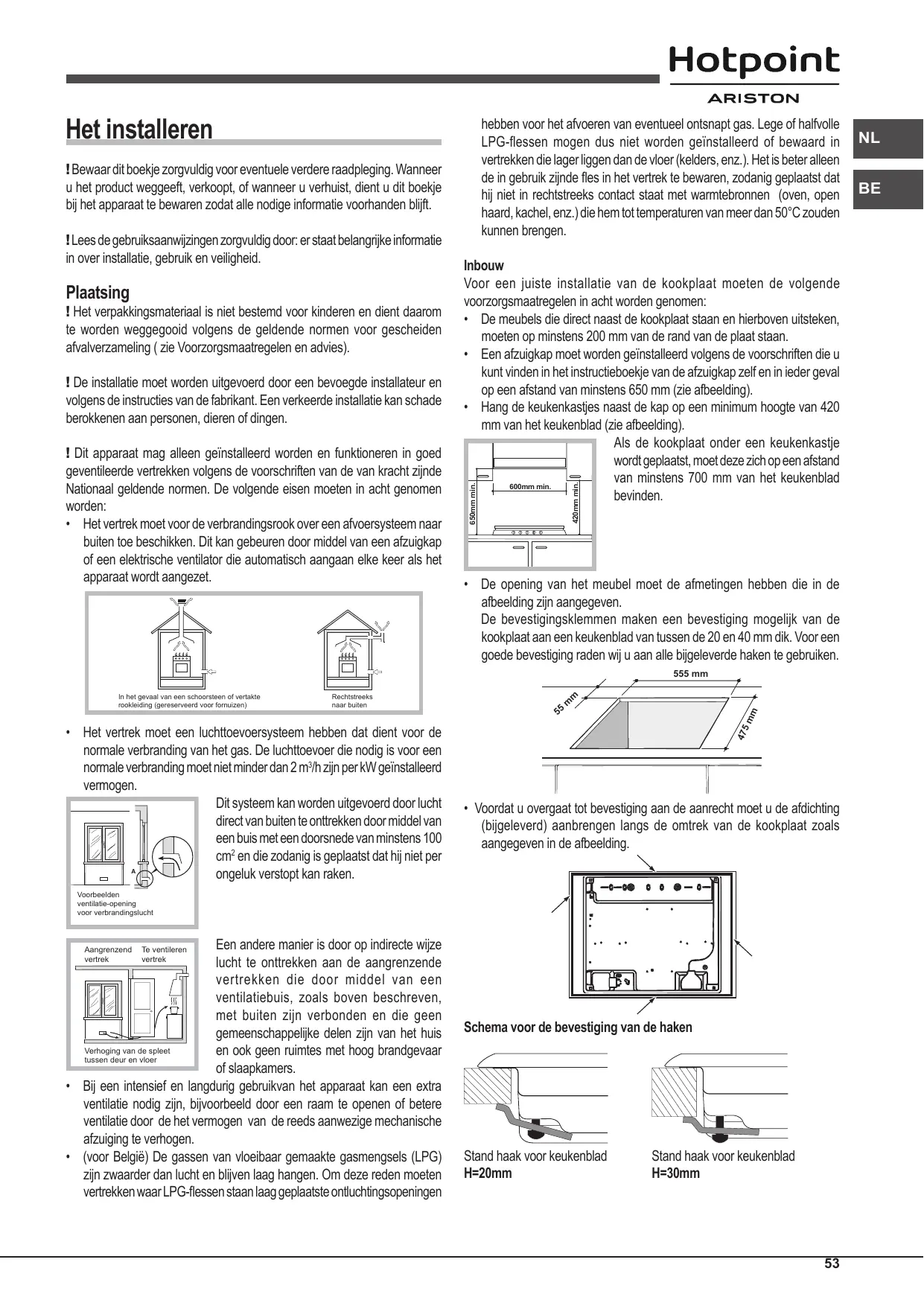 Inbouw Voor een juiste installatie van de kookplaat moeten de volgende voorzorgsmaatregelen in acht worden genomen: • De meubels die direct naast de kookplaat staan en hierboven uitsteken, moeten op minstens 200 mm van de rand van de plaat staan. • Een afzuigkap moet worden geïnstalleerd volgens de voorschriften die u kunt vinden in het instructieboekje van de afzuigkap zelf en in ieder geval op een afstand van minstens 650 mm (zie afbeelding). • Hang de keukenkastjes naast de kap op een minimum hoogte van 420 mm van het keukenblad (zie afbeelding). Als de kookplaat onder een keukenkastje wordt geplaatst, moet deze zich op een afstand van minstens 700 mm van het keukenblad 600mm min. bevinden. 650mm min.