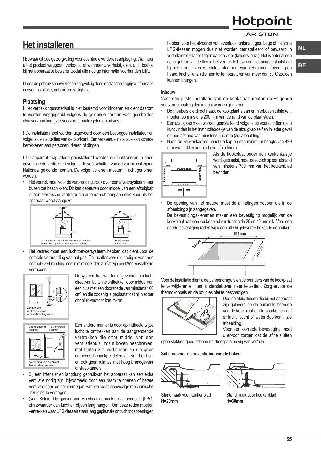 H=30mm BE LU NL Position du crochet pour top H=40mm Pour garantir une bonne aération, la cavité d’encastrement doit être dépourvue de paroi arrière. Il est conseillé d’installer le four de manière à ce qu’il repose sur deux cales en bois ou bien sur un plan d’appui continu qui ait une découpe d’au moins 45 x 560 mm (voir figures).