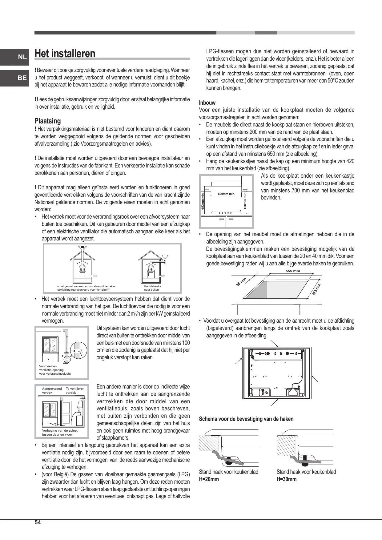 ! Het verpakkingsmateriaal is niet bestemd voor kinderen en dient daarom te worden weggegooid volgens de geldende normen voor gescheiden afvalverzameling ( zie Voorzorgsmaatregelen en advies). ! De installatie moet worden uitgevoerd door een bevoegde installateur en volgens de instructies van de fabrikant. Een verkeerde installatie kan schade berokkenen aan personen, dieren of dingen. ! Dit apparaat mag alleen geïnstalleerd worden en funktioneren in goed geventileerde vertrekken volgens de voorschriften van de van kracht zijnde Nationaal geldende normen. De volgende eisen moeten in acht genomen worden: • Het vertrek moet voor de verbrandingsrook over een afvoersysteem naar buiten toe beschikken. Dit kan gebeuren door middel van een afzuigkap of een elektrische ventilator die automatisch aangaan elke keer als het apparaat wordt aangezet.