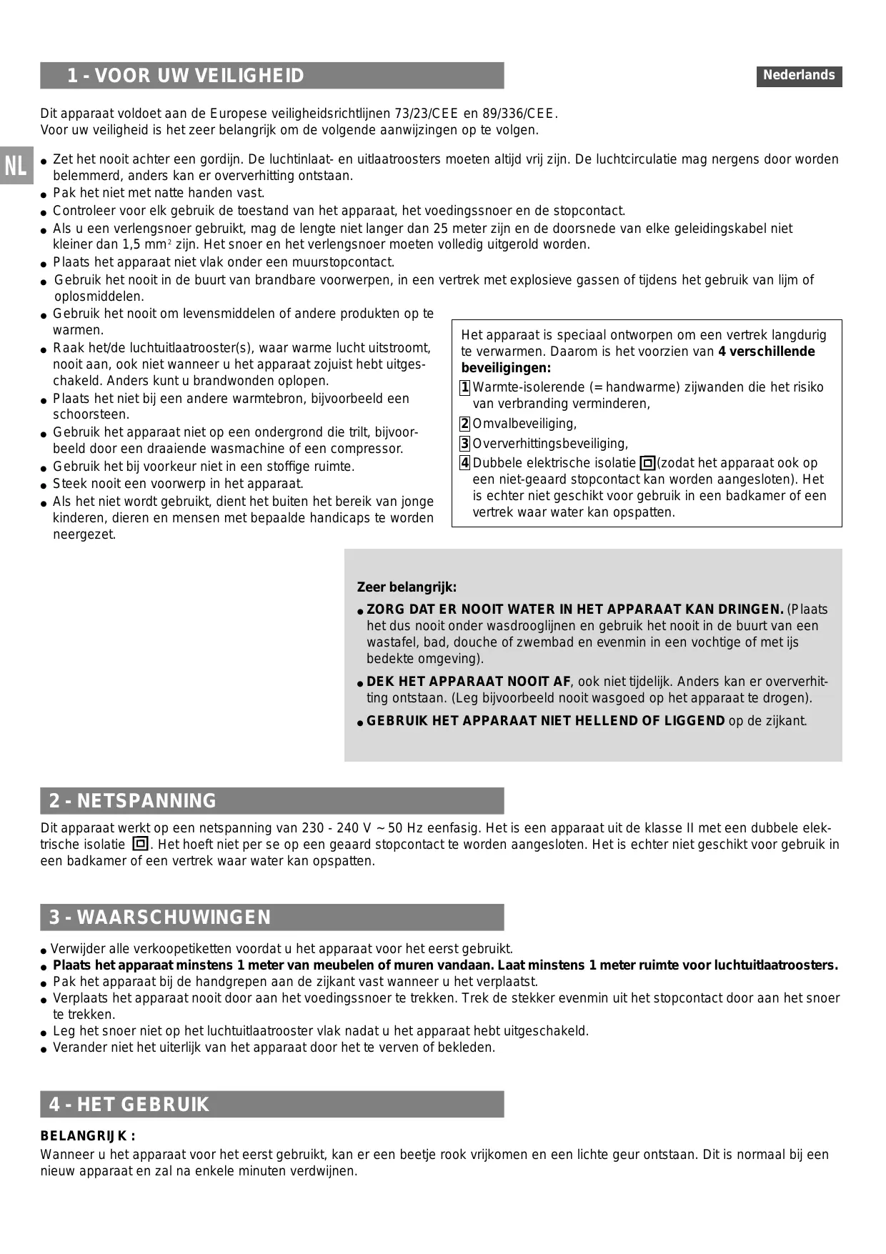 Zet het nooit achter een gordijn. De luchtinlaat- en uitlaatroosters moeten altijd vrij zijn. De luchtcirculatie mag nergens door worden belemmerd, anders kan er oververhitting ontstaan. Pak het niet met natte handen vast. Controleer voor elk gebruik de toestand van het apparaat, het voedingssnoer en de stopcontact. Als u een verlengsnoer gebruikt, mag de lengte niet langer dan 25 meter zijn en de doorsnede van elke geleidingskabel niet kleiner dan 1,5 mm 2 zijn. Het snoer en het verlengsnoer moeten volledig uitgerold worden. Plaats het apparaat niet vlak onder een muurstopcontact. Gebruik het nooit in de buurt van brandbare voorwerpen, in een vertrek met explosieve gassen of tijdens het gebruik van lijm of oplosmiddelen. Gebruik het nooit om levensmiddelen of andere produkten op te warmen. Het apparaat is speciaal ontworpen om een vertrek langdurig Raak het/de luchtuitlaatrooster(s), waar warme lucht uitstroomt, te verwarmen. Daarom is het voorzien van 4 verschillende nooit aan, ook niet wanneer u het apparaat zojuist hebt uitgesbeveiligingen: chakeld. Anders kunt u brandwonden oplopen. 1 Warmte-isolerende (= handwarme) zijwanden die het risiko Plaats het niet bij een andere warmtebron, bijvoorbeeld een van verbranding verminderen, schoorsteen. 2 Omvalbeveiliging, Gebruik het apparaat niet op een ondergrond die trilt, bijvoor3 Oververhittingsbeveiliging, beeld door een draaiende wasmachine of een compressor. 4 Dubbele elektrische isolatie (zodat het apparaat ook op Gebruik het bij voorkeur niet in een stoffige ruimte. een niet-geaard stopcontact kan worden aangesloten). Het Steek nooit een voorwerp in het apparaat. is echter niet geschikt voor gebruik in een badkamer of een Als het niet wordt gebruikt, dient het buiten het bereik van jonge vertrek waar water kan opspatten. kinderen, dieren en mensen met bepaalde handicaps te worden neergezet.