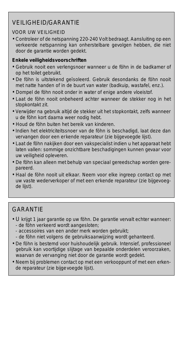 GARANTIE • U krijgt 1 jaar garantie op uw föhn. De garantie vervalt echter wanneer: - de föhn verkeerd wordt aangesloten; - accessoires van een ander merk worden gebruikt; - de föhn niet volgens de gebruiksaanwijzing wordt gehanteerd. • De föhn is bestemd voor huishoudelijk gebruik. Intensief, professioneel gebruik kan voortijdige slijtage van bepaalde onderdelen veroorzaken, waarvan de vervanging niet door de garantie wordt gedekt. • Neem bij problemen contact op met een verkooppunt of met een erkende reparateur (zie bijgevoegde lijst).