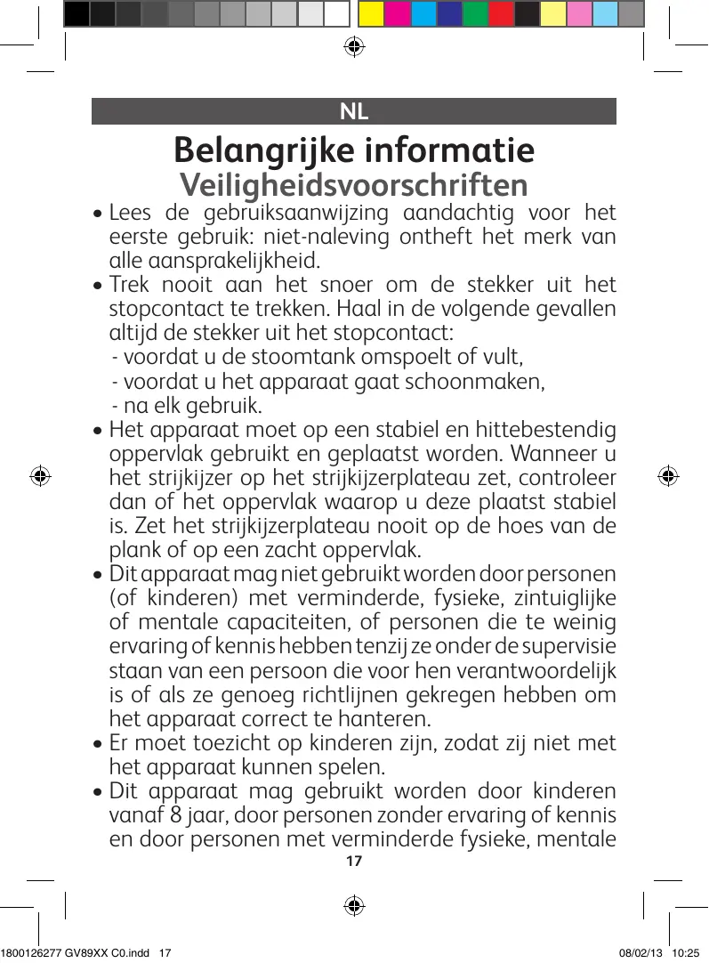 - Dit apparaat mag gebruikt worden door kinderen vanaf 8 jaar, door personen zonder ervaring of kennis en door personen met verminderde fysieke, mentale 1800126277 GV89XX C0.indd 17