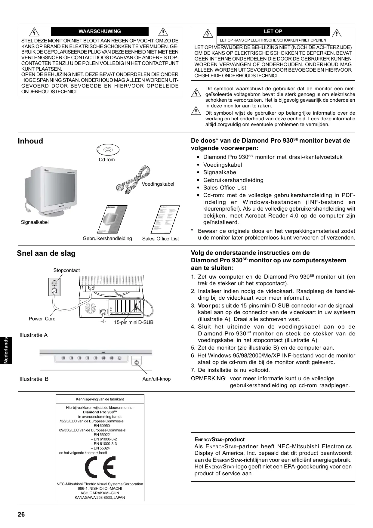 Nous certifions par la présente que le moniteur couleur Diamond Pro 930SB est conforme à la directive européenne 73/23/CE : – EN 60950 la directive européenne 89/336/CE : – EN 55022 – EN 61000-3-2 – EN 61000-3-3 – EN 55024 et porte la marque