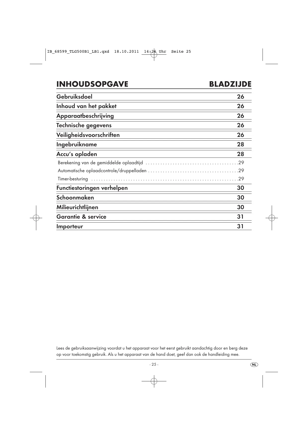 14:26 Uhr Seite 31 Garantie & service Importeur U heeft op dit apparaat 3 jaar garantie vanaf de aankoopdatum. Het apparaat is met de grootst mogelijke zorg vervaardigd en voorafgaand aan de levering nauwkeurig gecontroleerd. Bewaar a.u.b. de kassabon als aankoopbewijs. Als u aanspraak wilt maken op garantie, neem dan a.u.b. telefonisch contact op met uw servicefiliaal. Alleen op die manier is een kostenloze verzending van uw product gegarandeerd. De garantie geldt alleen voor materiaal- of fabricagefouten, echter niet voor transportschade, of voor onderdelen die aan slijtage onderhevig zijn, of voor beschadigingen aan breekbare delen, bijv. schakelaars of accu's. Het product is uitsluitend bestemd voor privé-gebruik en niet voor bedrijfsmatige doeleinden. Bij verkeerd gebruik en ondeskundige behandeling, bij gebruik van geweld en bij reparaties die niet door ons geautoriseerd servicefiliaal zijn uitgevoerd, vervalt de garantie. Uw wettelijke rechten worden door deze garantie niet beperkt. De garantieperiode wordt niet verlengd door de aansprakelijkheid. Dit geldt eveneens voor vervangen en gerepareerde onderdelen. Schade en gebreken die mogelijk reeds bij de aankoop aanwezig zijn, moeten direct na het uitpakken worden gemeld, uiterlijk echter twee dagen na de dag van aankoop. Na verstrijken van de garantieperiode moeten alle voorkomende reparaties vergoed worden. KOMPERNASS GMBH BURGSTRASSE 21 44867 BOCHUM, GERMANY www.kompernass.com Service Nederland Tel.: 0900 0400223 (0,10 EUR/Min.) E-Mail: kompernass@lidl.nl IAN 68599