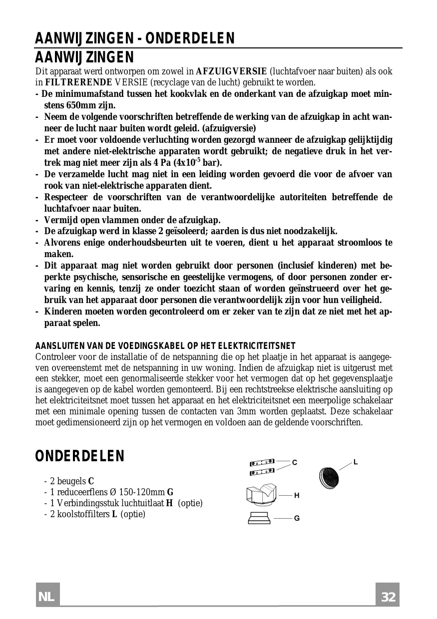 AANWIJZINGEN Dit apparaat werd ontworpen om zowel in AFZUIGVERSIE (luchtafvoer naar buiten) als ook in FILTRERENDE VERSIE (recyclage van de lucht) gebruikt te worden. - De minimumafstand tussen het kookvlak en de onderkant van de afzuigkap moet minstens 650mm zijn. - Neem de volgende voorschriften betreffende de werking van de afzuigkap in acht wanneer de lucht naar buiten wordt geleid. (afzuigversie) - Er moet voor voldoende verluchting worden gezorgd wanneer de afzuigkap gelijktijdig met andere niet-elektrische apparaten wordt gebruikt; de negatieve druk in het vertrek mag niet meer zijn als 4 Pa (4x10-5 bar). - De verzamelde lucht mag niet in een leiding worden gevoerd die voor de afvoer van rook van niet-elektrische apparaten dient. - Respecteer de voorschriften van de verantwoordelijke autoriteiten betreffende de luchtafvoer naar buiten. - Vermijd open vlammen onder de afzuigkap. - De afzuigkap werd in klasse 2 geïsoleerd; aarden is dus niet noodzakelijk. - Alvorens enige onderhoudsbeurten uit te voeren, dient u het apparaat stroomloos te maken. - Dit apparaat mag niet worden gebruikt door personen (inclusief kinderen) met beperkte psychische, sensorische en geestelijke vermogens, of door personen zonder ervaring en kennis, tenzij ze onder toezicht staan of worden geïnstrueerd over het gebruik van het apparaat door personen die verantwoordelijk zijn voor hun veiligheid. - Kinderen moeten worden gecontroleerd om er zeker van te zijn dat ze niet met het apparaat spelen. AANSLUITEN VAN DE VOEDINGSKABEL OP HET ELEKTRICITEITSNET Controleer voor de installatie of de netspanning die op het plaatje in het apparaat is aangegeven overeenstemt met de netspanning in uw woning. Indien de afzuigkap niet is uitgerust met een stekker, moet een genormaliseerde stekker voor het vermogen dat op het gegevensplaatje is aangegeven op de kabel worden gemonteerd. Bij een rechtstreekse elektrische aansluiting op het elektriciteitsnet moet tussen het apparaat en het elektriciteitsnet een meerpolige schakelaar met een minimale opening tussen de contacten van 3mm worden geplaatst. Deze schakelaar moet gedimensioneerd zijn op het vermogen en voldoen aan de geldende voorschriften. ONDERDELEN - 2 beugels C - 1 reduceerflens Ø 150-120mm G - 1 Verbindingsstuk luchtuitlaat H (optie) - 2 koolstoffilters L (optie)