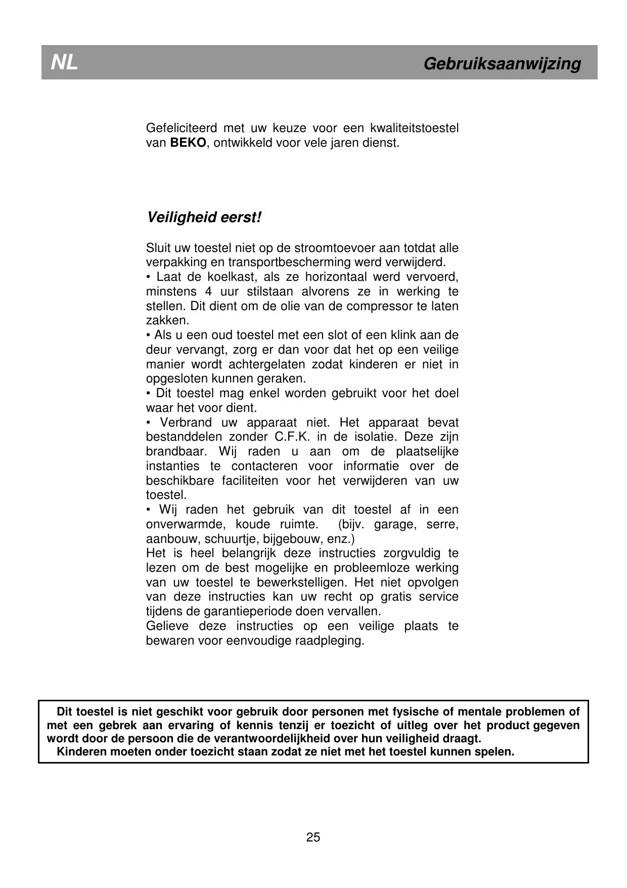 - Wij raden het gebruik van dit toestel af in een onverwarmde, koude ruimte. (bijv. garage, serre, aanbouw, schuurtje, bijgebouw, enz.) Het is heel belangrijk deze instructies zorgvuldig te lezen om de best mogelijke en probleemloze werking van uw toestel te bewerkstelligen. Het niet opvolgen van deze instructies kan uw recht op gratis service tijdens de garantieperiode doen vervallen. Gelieve deze instructies op een veilige plaats te bewaren voor eenvoudige raadpleging. Dit toestel is niet geschikt voor gebruik door personen met fysische of mentale problemen of met een gebrek aan ervaring of kennis tenzij er toezicht of uitleg over het product gegeven wordt door de persoon die de verantwoordelijkheid over hun veiligheid draagt. Kinderen moeten onder toezicht staan zodat ze niet met het toestel kunnen spelen.