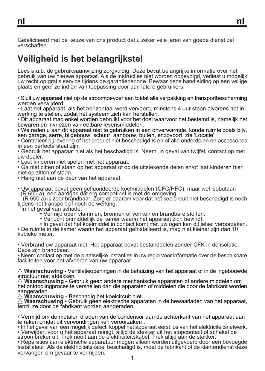 + Uw apparaat bevat geen gefluorideerde koelmiddelen (CFC/HFC), maar wel isobutaan (R 600 a), een aardgas dat eg compatibel is met de omaeving. (R 600 a) is zeer brandbaar. Zorg er daarom voor dat het koelcircuit niet beschadigd is noch tijdens het transport of noch de werking. In het geval van schade: + Vermijd open vlammen, bronnen of vonken en brandbare stoffen. + Verlucht onmiddellijk de kamer waarin het apparaat zich bevindt. + In geval dat het koelmiddel in contact komt met uw ogen kan dit letsel veroorzaken. De ruimte in de kamer waarin het apparaat geïnstalleerd is, mag niet kleiner zijn dan 10 ubieke meter.