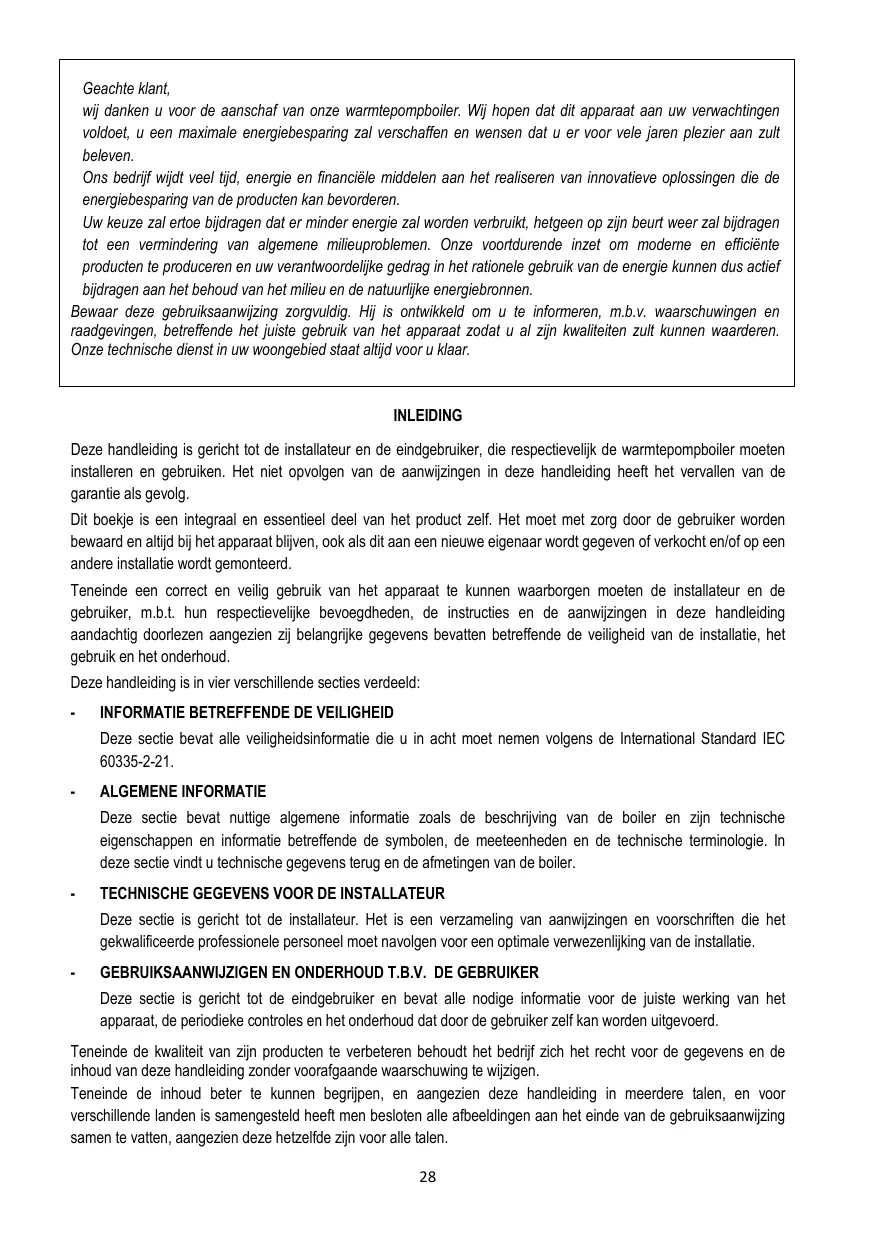 EN 16147. CAHIER DE CHARGE_103-15/B__2011 Chauffe-eau Thermodynamiques POUR LA MARQUE NF elettricitè performance. 1.5 Verpakking en bijgeleverde accessoires Het apparaat is bevestigd op een houten pallet en wordt beschermd door hoekvormige piepschuim beschermelementen, karton en doorzichtig plastic folie aan de buitenkant. Alle materialen kunnen worden gerecycled en zijn milieuvriendelijk. De inbegrepen accessoires zijn: - Riem voor het bewegen van de boiler (moet worden verwijderd na de installatie van het apparaat); - Verbindingsbuis condenswater; - Handleiding en garanties;