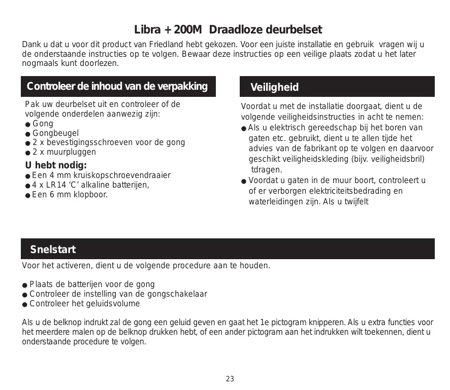 DUTCH Het plaatsen van de batterijen voor de gong ..... Standen van de schakelaar................................... Geluidsniveau......................................................... Schuifvenster ......................................................... Libra + 200M Draadloze deurbelset Dank u dat u voor dit product van Friedland hebt gekozen. Voor een juiste installatie en gebruik vragen wij u de onderstaande instructies op te volgen. Bewaar deze instructies op een veilige plaats zodat u het later nogmaals kunt doorlezen. Controleer de inhoud van de verpakking Veiligheid Pak uw deurbelset uit en controleer of de volgende onderdelen aanwezig zijn: ● Gong ● Gongbeugel ● 2 x bevestigingsschroeven voor de gong ● 2 x muurpluggen Voordat u met de installatie doorgaat, dient u de volgende veiligheidsinstructies in acht te nemen: ● Als u elektrisch gereedschap bij het boren van gaten etc. gebruikt, dient u te allen tijde het advies van de fabrikant op te volgen en daarvoor geschikt veiligheidskleding (bijv. veiligheidsbril) tdragen. ● Voordat u gaten in de muur boort, controleert u of er verborgen elektriciteitsbedrading en waterleidingen zijn. Als u twijfelt U hebt nodig: