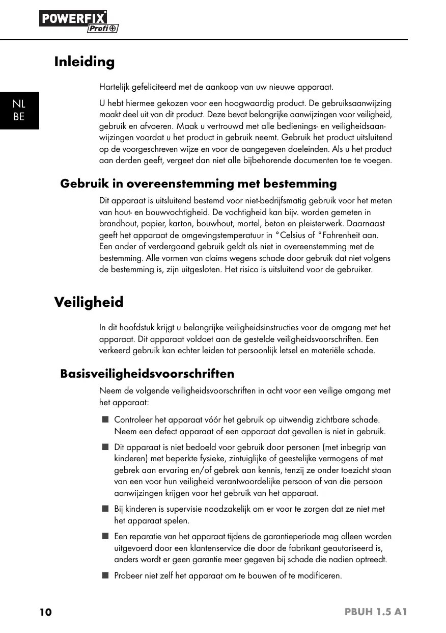 Gebruik in overeenstemming met bestemming Dit apparaat is uitsluitend bestemd voor niet-bedrijfsmatig gebruik voor het meten van hout- en bouwvochtigheid. De vochtigheid kan bijv. worden gemeten in brandhout, papier, karton, bouwhout, mortel, beton en pleisterwerk. Daarnaast geeft het apparaat de omgevingstemperatuur in °Celsius of °Fahrenheit aan. Een ander of verdergaand gebruik geldt als niet in overeenstemming met de bestemming. Alle vormen van claims wegens schade door gebruik dat niet volgens de bestemming is, zijn uitgesloten. Het risico is uitsluitend voor de gebruiker. Veiligheid In dit hoofdstuk krijgt u belangrijke veiligheidsinstructies voor de omgang met het apparaat. Dit apparaat voldoet aan de gestelde veiligheidsvoorschriften. Een verkeerd gebruik kan echter leiden tot persoonlijk letsel en materiële schade. Basisveiligheidsvoorschriften Neem de volgende veiligheidsvoorschriften in acht voor een veilige omgang met het apparaat: ■ Controleer het apparaat vóór het gebruik op uitwendig zichtbare schade. Neem een defect apparaat of een apparaat dat gevallen is niet in gebruik. ■ Dit apparaat is niet bedoeld voor gebruik door personen (met inbegrip van kinderen) met beperkte fysieke, zintuiglijke of geestelijke vermogens of met gebrek aan ervaring en/of gebrek aan kennis, tenzij ze onder toezicht staan van een voor hun veiligheid verantwoordelijke persoon of van die persoon aanwijzingen krijgen voor het gebruik van het apparaat. ■ Bij kinderen is supervisie noodzakelijk om er voor te zorgen dat ze niet met het apparaat spelen. ■ Een reparatie van het apparaat tijdens de garantieperiode mag alleen worden uitgevoerd door een klantenservice die door de fabrikant geautoriseerd is, anders wordt er geen garantie meer gegeven bij schade die nadien optreedt. ■ Probeer niet zelf het apparaat om te bouwen of te modificeren.