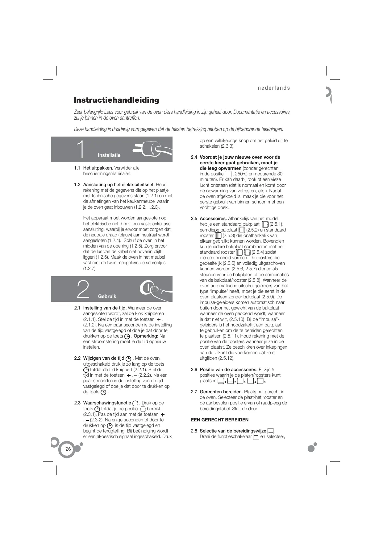 2.1 Instelling van de tijd. Wanneer de oven aangesloten wordt, zal de klok knipperen (2.1.1). Stel de tijd in met de toetsen , (2.1.2). Na een paar seconden is de instelling van de tijd vastgelegd of doe je dat door te drukken op de toets . Opmerking: Na een stroomstoring moet je de tijd opnieuw instellen. 2.2 Wijzigen van de tijd . Met de oven uitgeschakeld druk je zo lang op de toets totdat de tijd knippert (2.2.1). Stel de tijd in met de toetsen , (2.2.2). Na een paar seconden is de instelling van de tijd vastgelegd of doe je dat door te drukken op de toets . . Druk op de 2.3 Waarschuwingsfunctie toets totdat je de positie bereikt (2.3.1). Pas de tijd aan met de toetsen , (2.3.2). Na enige seconden of door te drukken op is de tijd vastgelegd en begint de terugtelling. Bij beëindiging wordt er een akoestisch signaal ingeschakeld. Druk 26