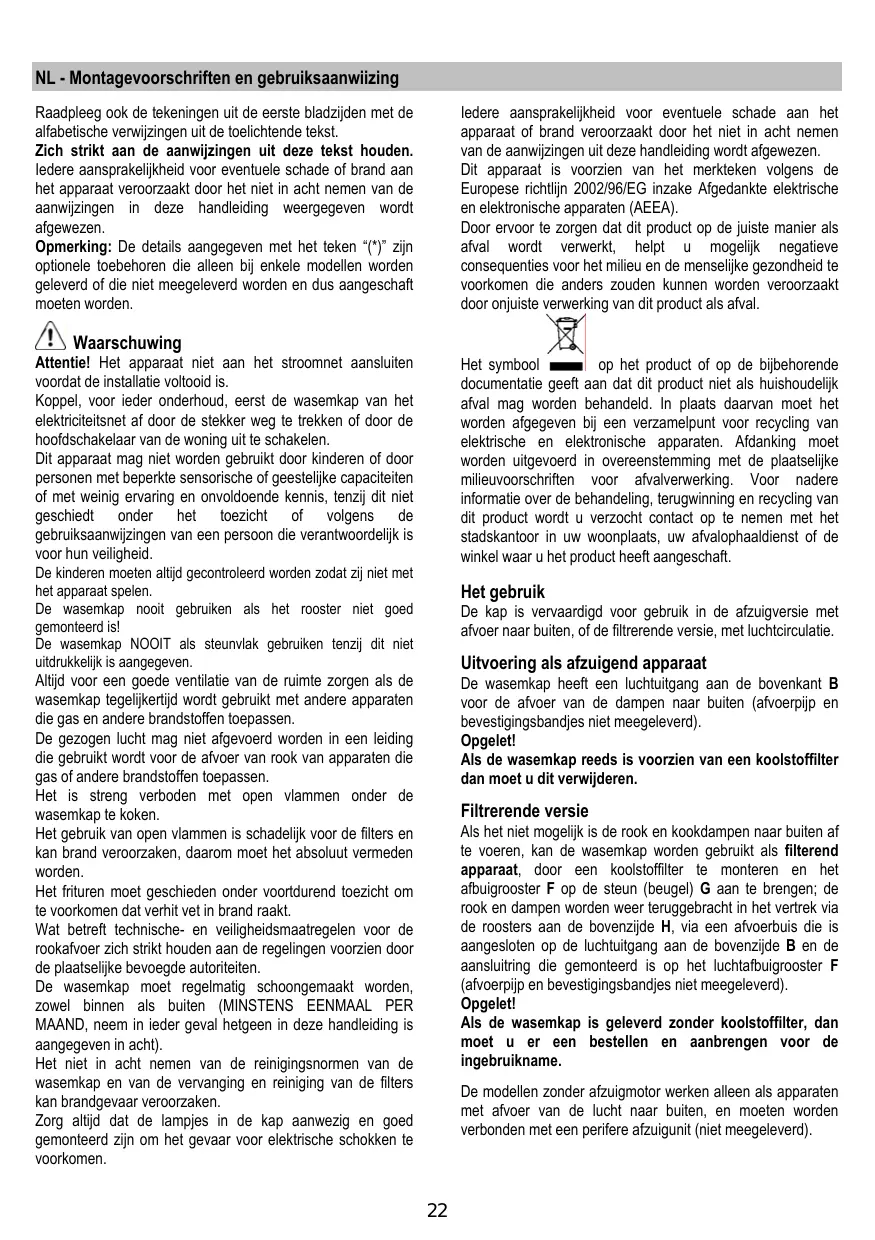 NL - Montagevoorschriften en gebruiksaanwiizing Raadpleeg ook de tekeningen uit de eerste bladzijden met de alfabetische verwijzingen uit de toelichtende tekst. Zich strikt aan de aanwijzingen uit deze tekst houden. Iedere aansprakelijkheid voor eventuele schade of brand aan het apparaat veroorzaakt door het niet in acht nemen van de aanwijzingen in deze handleiding weergegeven wordt afgewezen. Opmerking: De details aangegeven met het teken “(*)” zijn optionele toebehoren die alleen bij enkele modellen worden geleverd of die niet meegeleverd worden en dus aangeschaft moeten worden. Iedere aansprakelijkheid voor eventuele schade aan het apparaat of brand veroorzaakt door het niet in acht nemen van de aanwijzingen uit deze handleiding wordt afgewezen. Dit apparaat is voorzien van het merkteken volgens de Europese richtlijn 2002/96/EG inzake Afgedankte elektrische en elektronische apparaten (AEEA). Door ervoor te zorgen dat dit product op de juiste manier als afval wordt verwerkt, helpt u mogelijk negatieve consequenties voor het milieu en de menselijke gezondheid te voorkomen die anders zouden kunnen worden veroorzaakt door onjuiste verwerking van dit product als afval. Waarschuwing Attentie! Het apparaat niet aan het stroomnet aansluiten voordat de installatie voltooid is. Koppel, voor ieder onderhoud, eerst de wasemkap van het elektriciteitsnet af door de stekker weg te trekken of door de hoofdschakelaar van de woning uit te schakelen. Dit apparaat mag niet worden gebruikt door kinderen of door personen met beperkte sensorische of geestelijke capaciteiten of met weinig ervaring en onvoldoende kennis, tenzij dit niet geschiedt onder het toezicht of volgens de gebruiksaanwijzingen van een persoon die verantwoordelijk is voor hun veiligheid. op het product of op de bijbehorende Het symbool documentatie geeft aan dat dit product niet als huishoudelijk afval mag worden behandeld. In plaats daarvan moet het worden afgegeven bij een verzamelpunt voor recycling van elektrische en elektronische apparaten. Afdanking moet worden uitgevoerd in overeenstemming met de plaatselijke milieuvoorschriften voor afvalverwerking. Voor nadere informatie over de behandeling, terugwinning en recycling van dit product wordt u verzocht contact op te nemen met het stadskantoor in uw woonplaats, uw afvalophaaldienst of de winkel waar u het product heeft aangeschaft. De kinderen moeten altijd gecontroleerd worden zodat zij niet met het apparaat spelen. De wasemkap nooit gebruiken als het rooster niet goed gemonteerd is! De wasemkap NOOIT als steunvlak gebruiken tenzij dit niet uitdrukkelijk is aangegeven. Het gebruik De kap is vervaardigd voor gebruik in de afzuigversie met afvoer naar buiten, of de filtrerende versie, met luchtcirculatie. Uitvoering als afzuigend apparaat Altijd voor een goede ventilatie van de ruimte zorgen als de wasemkap tegelijkertijd wordt gebruikt met andere apparaten die gas en andere brandstoffen toepassen. De gezogen lucht mag niet afgevoerd worden in een leiding die gebruikt wordt voor de afvoer van rook van apparaten die gas of andere brandstoffen toepassen. Het is streng verboden met open vlammen onder de wasemkap te koken. Het gebruik van open vlammen is schadelijk voor de filters en kan brand veroorzaken, daarom moet het absoluut vermeden worden. Het frituren moet geschieden onder voortdurend toezicht om te voorkomen dat verhit vet in brand raakt. Wat betreft technische- en veiligheidsmaatregelen voor de rookafvoer zich strikt houden aan de regelingen voorzien door de plaatselijke bevoegde autoriteiten. De wasemkap moet regelmatig schoongemaakt worden, zowel binnen als buiten (MINSTENS EENMAAL PER MAAND, neem in ieder geval hetgeen in deze handleiding is aangegeven in acht). Het niet in acht nemen van de reinigingsnormen van de wasemkap en van de vervanging en reiniging van de filters kan brandgevaar veroorzaken. Zorg altijd dat de lampjes in de kap aanwezig en goed gemonteerd zijn om het gevaar voor elektrische schokken te voorkomen. De wasemkap heeft een luchtuitgang aan de bovenkant B voor de afvoer van de dampen naar buiten (afvoerpijp en bevestigingsbandjes niet meegeleverd). Opgelet! Als de wasemkap reeds is voorzien van een koolstoffilter dan moet u dit verwijderen. Filtrerende versie Als het niet mogelijk is de rook en kookdampen naar buiten af te voeren, kan de wasemkap worden gebruikt als filterend apparaat, door een koolstoffilter te monteren en het afbuigrooster F op de steun (beugel) G aan te brengen; de rook en dampen worden weer teruggebracht in het vertrek via de roosters aan de bovenzijde H, via een afvoerbuis die is aangesloten op de luchtuitgang aan de bovenzijde B en de aansluitring die gemonteerd is op het luchtafbuigrooster F (afvoerpijp en bevestigingsbandjes niet meegeleverd). Opgelet! Als de wasemkap is geleverd zonder koolstoffilter, dan moet u er een bestellen en aanbrengen voor de ingebruikname. De modellen zonder afzuigmotor werken alleen als apparaten met afvoer van de lucht naar buiten, en moeten worden verbonden met een perifere afzuigunit (niet meegeleverd).