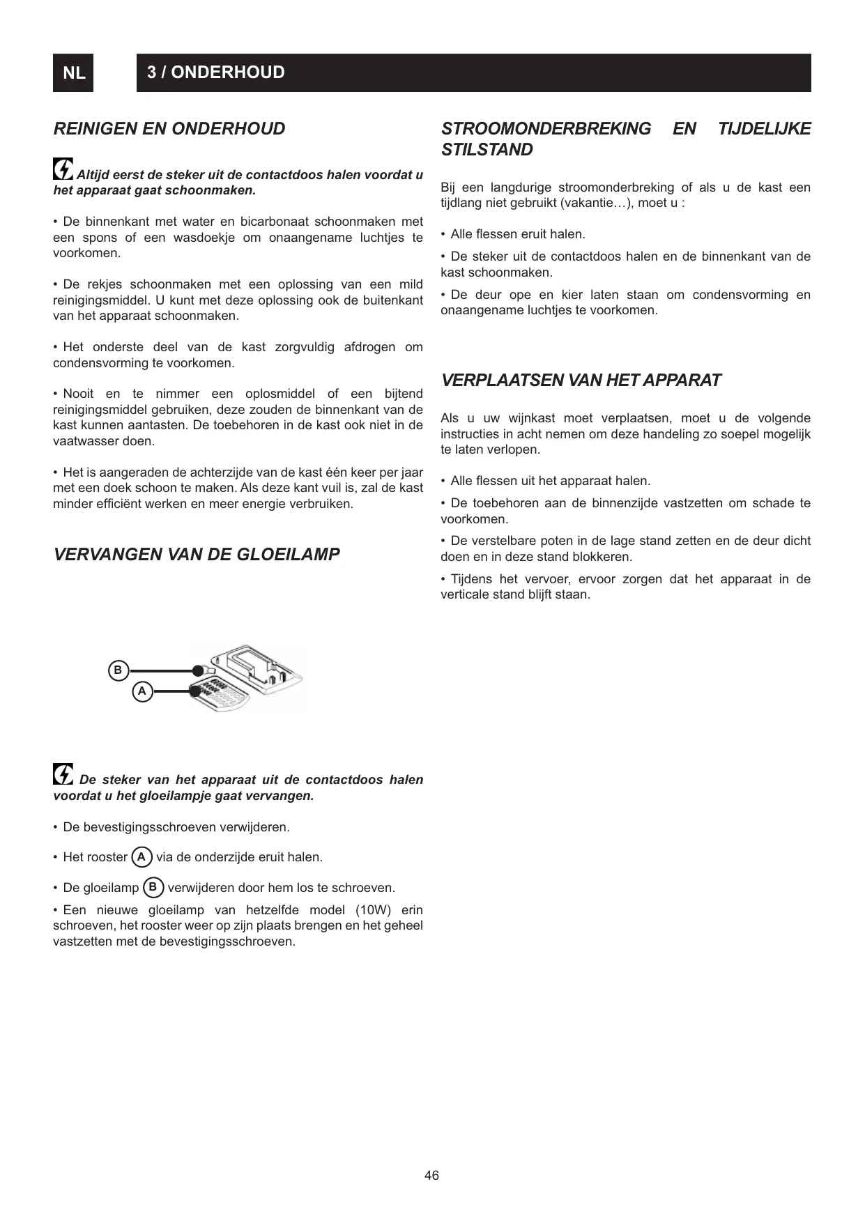 - De steker uit de contactdoos halen en de binnenkant van de kast schoonmaken.