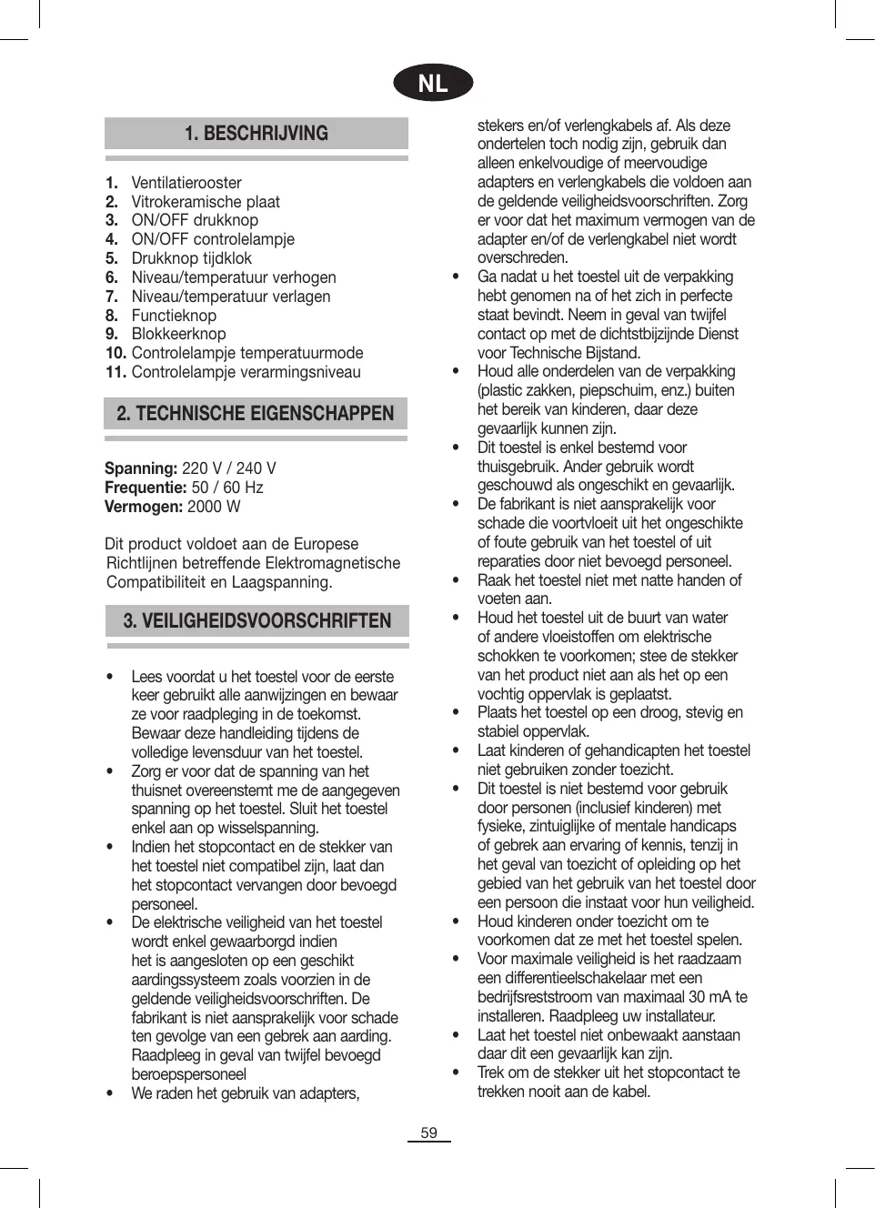 stekers en/of verlengkabels af. Als deze ondertelen toch nodig zijn, gebruik dan alleen enkelvoudige of meervoudige adapters en verlengkabels die voldoen aan de geldende veiligheidsvoorschriften. Zorg er voor dat het maximum vermogen van de adapter en/of de verlengkabel niet wordt overschreden. Ga nadat u het toestel uit de verpakking hebt genomen na of het zich in perfecte staat bevindt. Neem in geval van twijfel contact op met de dichtstbijzijnde Dienst voor Technische Bijstand. Houd alle onderdelen van de verpakking (plastic zakken, piepschuim, enz.) buiten het bereik van kinderen, daar deze gevaarlijk kunnen zijn. Dit toestel is enkel bestemd voor thuisgebruik. Ander gebruik wordt geschouwd als ongeschikt en gevaarlijk. De fabrikant is niet aansprakelijk voor schade die voortvloeit uit het ongeschikte of foute gebruik van het toestel of uit reparaties door niet bevoegd personeel. Raak het toestel niet met natte handen of voeten aan. Houd het toestel uit de buurt van water of andere vloeistoffen om elektrische schokken te voorkomen; stee de stekker van het product niet aan als het op een vochtig oppervlak is geplaatst. Plaats het toestel op een droog, stevig en stabiel oppervlak. Laat kinderen of gehandicapten het toestel niet gebruiken zonder toezicht. Dit toestel is niet bestemd voor gebruik door personen (inclusief kinderen) met fysieke, zintuiglijke of mentale handicaps of gebrek aan ervaring of kennis, tenzij in het geval van toezicht of opleiding op het gebied van het gebruik van het toestel door een persoon die instaat voor hun veiligheid. Houd kinderen onder toezicht om te voorkomen dat ze met het toestel spelen. Voor maximale veiligheid is het raadzaam een differentieelschakelaar met een bedrijfsreststroom van maximaal 30 mA te installeren. Raadpleeg uw installateur. Laat het toestel niet onbewaakt aanstaan daar dit een gevaarlijk kan zijn. Trek om de stekker uit het stopcontact te trekken nooit aan de kabel.