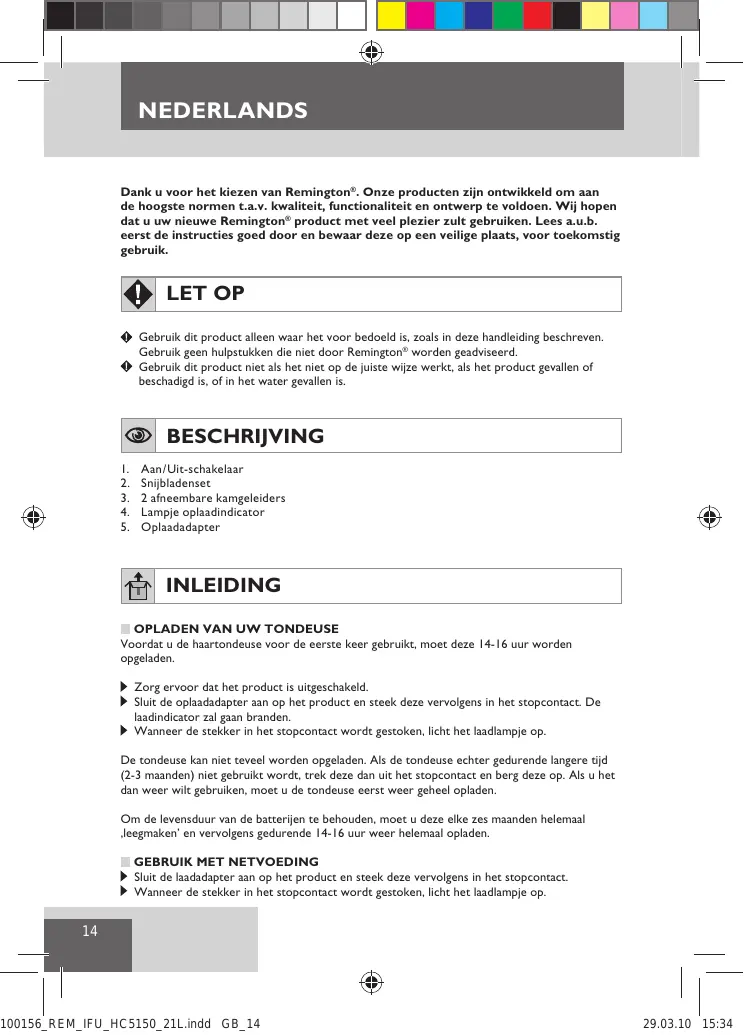 VOORZICHTIG: Gebruik geen vloeibare reinigingsmiddelen op de snijbladen of agressieve of bijtende chemicaliën op de behuizing van de snijbladen. Gebruik altijd een zacht borsteltje om opgehoopte haren te verwijderen. Haal de adapter uit het stopcontact wanneer u hulpstukken plaatst of verwijdert of het product reinigt. Berg dit apparaat en de bijbehorende snoer altijd in een vochtvrije ruimte op. Wikkel het snoer van de adapter niet om het apparaat. 100156_REM_IFU_HC5150_21L.indd GB_17