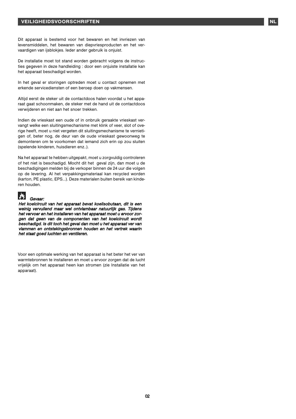 Dit apparaat is bestemd voor het bewaren en het invriezen van levensmiddelen, het bewaren van diepvriesproducten en het vervaardigen van ijsblokjes. Ieder ander gebruik is onjuist. De installatie moet tot stand worden gebracht volgens de instructies gegeven in deze handleiding : door een onjuiste installatie kan het apparaat beschadigd worden. In het geval er storingen optreden moet u contact opnemen met erkende servicediensten of een beroep doen op vakmensen. Altijd eerst de steker uit de contactdoos halen voordat u het apparaat gaat schoonmaken, de steker met de hand uit de contactdoos verwijderen en niet aan het snoer trekken. Indien de vrieskast een oude of in onbruik geraakte vrieskast vervangt welke een sluitingsmechanisme met klink of veer, slot of overige heeft, moet u niet vergeten dit sluitingsmechanisme te vernietigen of, beter nog, de deur van de oude vrieskast gewoonweg te demonteren om te voorkomen dat iemand zich erin op zou sluiten (spelende kinderen, huisdieren enz..). Na het apparaat te hebben uitgepakt, moet u zorgvuldig controleren of het niet is beschadigd. Mocht dit het geval zijn, dan moet u de beschadigingen melden bij de verkoper binnen de 24 uur die volgen op de levering. Al het verpakkingsmateriaal kan recycled worden (karton, PE plastic, EPS...). Deze materialen buiten bereik van kinderen houden. Gevaar: Het koelcircuit van het apparaat bevat koelisobutaan, dit is een weinig vervuilend maar wel ontvlambaar natuurlijk gas. Tijdens het vervoer en het installeren van het apparaat moet u ervoor zorgen dat geen van de componenten van het koelcircuit wordt beschadigd. Is dit toch het geval dan moet u het apparaat ver van vlammen en ontstekingsbronnen houden en het vertrek waarin het staat goed luchten en ventileren. Voor een optimale werking van het apparaat is het beter het ver van warmtebronnen te installeren en moet u ervoor zorgen dat de lucht vrijelijk om het apparaat heen kan stromen (zie Installatie van het apparaat).