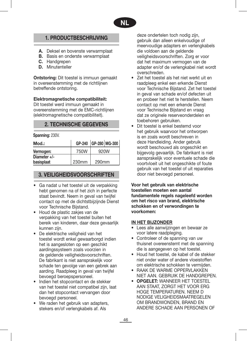 Deksel en bovenste verwarmplaat Basis en onderste verwarmplaat Handgrepen Minutenteller Ontstoring: Dit toestel is immuun gemaakt in overeenstemming met de richtlijnen betreffende ontstoring. Elektromagnetische compatibiliteit: Dit toestel werd immuun gemaakt in overeenstemming met de EMC-richtlijnen (elektromagnetische compatibiliteit).
