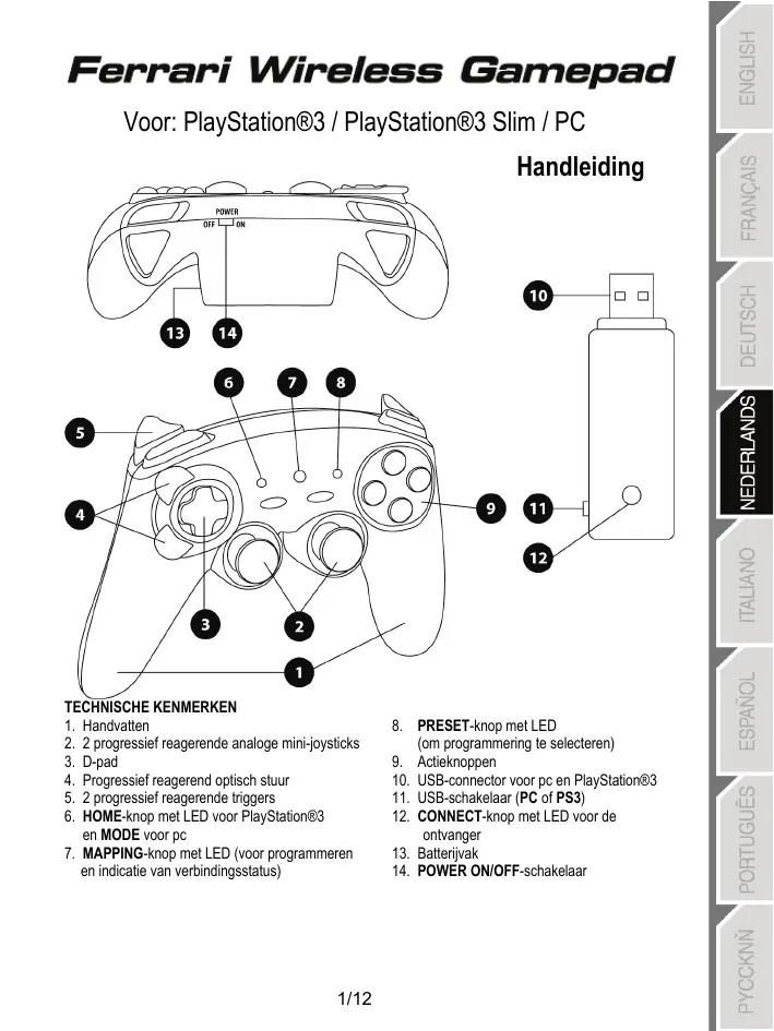 8. PRESET-knop met LED (om programmering te selecteren) 9. Actieknoppen 10. USB-connector voor pc en PlayStation®3 11. USB-schakelaar (PC of PS3) 12. CONNECT-knop met LED voor de ontvanger 13. Batterijvak 14. POWER ON/OFF-schakelaar