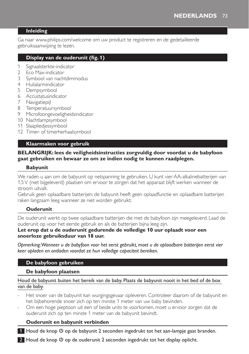 Signaalsterkte-indicator Eco Max-indicator Symbool van nachtdimmodus Huilalarmindicator Dempsymbool Accustatusindicator Navigatiepijl Temperatuursymbool Microfoongevoeligheidsindicator Nachtlampsymbool Slaapliedjessymbool Timer- of timerherhaalsymbool Klaarmaken voor gebruik BELANGRIJK: lees de veiligheidsinstructies zorgvuldig door voordat u de babyfoon gaat gebruiken en bewaar ze om ze indien nodig te kunnen raadplegen. Babyunit We raden u aan om de babyunit op netspanning te gebruiken. U kunt vier AA-alkalinebatterijen van 1,5 V (niet bijgeleverd) plaatsen om ervoor te zorgen dat het apparaat blijft werken wanneer de stroom uitvalt. Gebruik geen oplaadbare batterijen; de babyunit heeft geen oplaadfunctie en oplaadbare batterijen raken langzaam leeg wanneer ze niet worden gebruikt. Ouderunit De ouderunit werkt op twee oplaadbare batterijen die met de babyfoon zijn meegeleverd. Laad de ouderunit op voor het eerste gebruik en als de batterijen bijna leeg zijn. Let erop dat u de ouderunit gedurende de volledige 10 uur oplaadt voor een snoerloze gebruiksduur van 18 uur. Opmerking:Wanneer u de babyfoon voor het eerst gebruikt, moet u de oplaadbare batterijen eerst vier keer opladen en ontladen voordat ze hun volledige capaciteit bereiken. De babyfoon gebruiken De babyfoon plaatsen Houd de babyunit buiten het bereik van de baby. Plaats de babyunit nooit in het bed of de box van de baby. -- Het snoer van de babyunit kan wurgingsgevaar opleveren. Controleer daarom of de babyunit en het bijbehorende snoer zich op ten minste 1 meter van uw baby bevinden. -- Om een hoge pieptoon uit een of beide units te voorkomen, moet u ervoor zorgen dat de ouderunit zich op ten minste 1 meter van de babyunit bevindt. Ouderunit en babyunit verbinden 1 Houd de knop 3 op de babyunit 2 seconden ingedrukt tot het aan-lampje gaat branden. 2 Houd de knop 3 op de ouderunit 2 seconden ingedrukt tot het display oplicht.