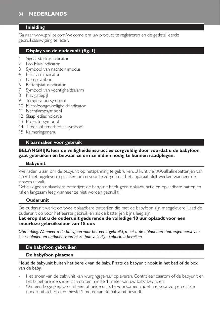 Nederlands Inleiding Ga naar www.philips.com/welcome om uw product te registreren en de gedetailleerde gebruiksaanwijzing te lezen. Display van de ouderunit (fig. 1)