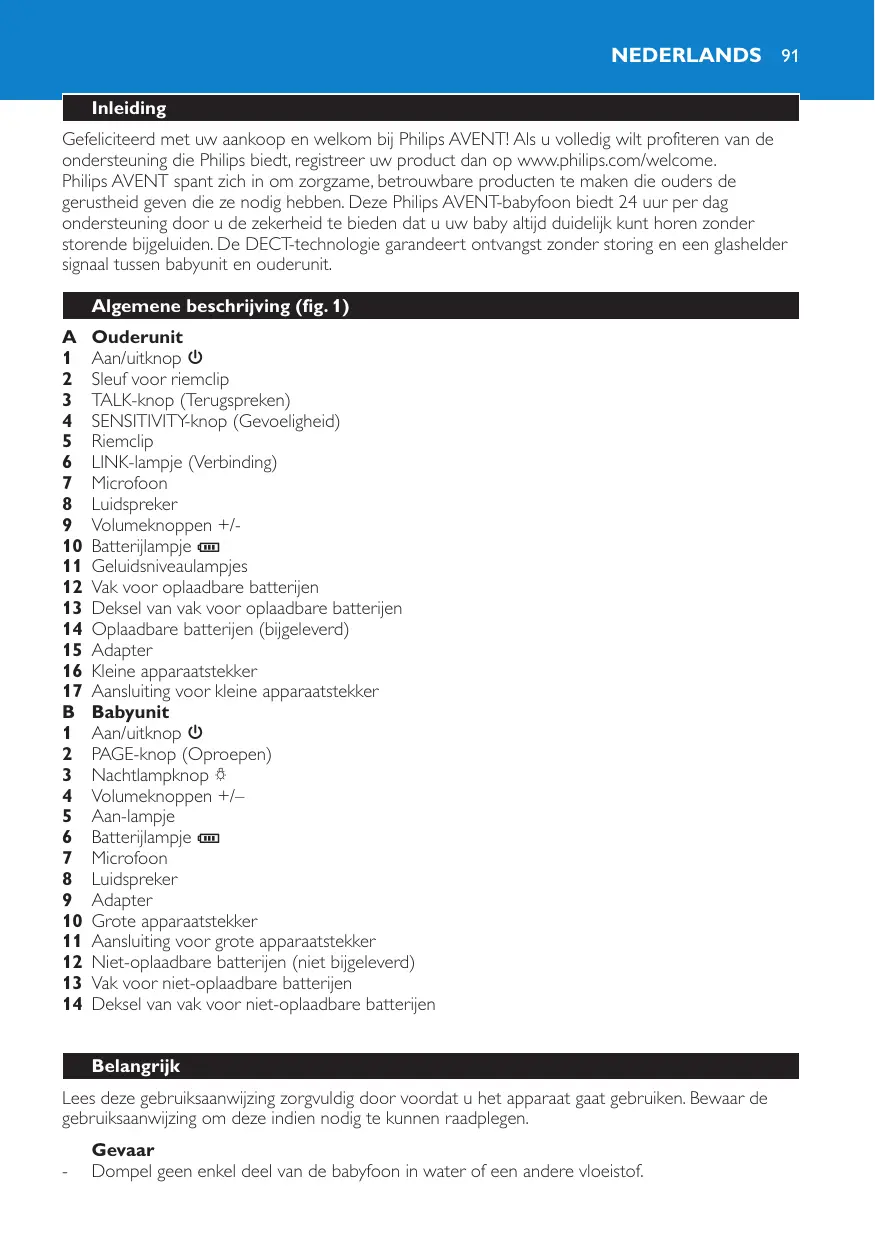 Ouderunit Aan/uitknop 3 Sleuf voor riemclip TALK-knop (Terugspreken) SENSITIVITY-knop (Gevoeligheid) Riemclip LINK-lampje (Verbinding) Microfoon Luidspreker Volumeknoppen +/Batterijlampje T Geluidsniveaulampjes Vak voor oplaadbare batterijen Deksel van vak voor oplaadbare batterijen Oplaadbare batterijen (bijgeleverd) Adapter Kleine apparaatstekker Aansluiting voor kleine apparaatstekker Babyunit Aan/uitknop 3 PAGE-knop (Oproepen) Nachtlampknop Q Volumeknoppen +/– Aan-lampje Batterijlampje T Microfoon Luidspreker Adapter Grote apparaatstekker Aansluiting voor grote apparaatstekker Niet-oplaadbare batterijen (niet bijgeleverd) Vak voor niet-oplaadbare batterijen Deksel van vak voor niet-oplaadbare batterijen Belangrijk Lees deze gebruiksaanwijzing zorgvuldig door voordat u het apparaat gaat gebruiken. Bewaar de gebruiksaanwijzing om deze indien nodig te kunnen raadplegen. Gevaar -- Dompel geen enkel deel van de babyfoon in water of een andere vloeistof.