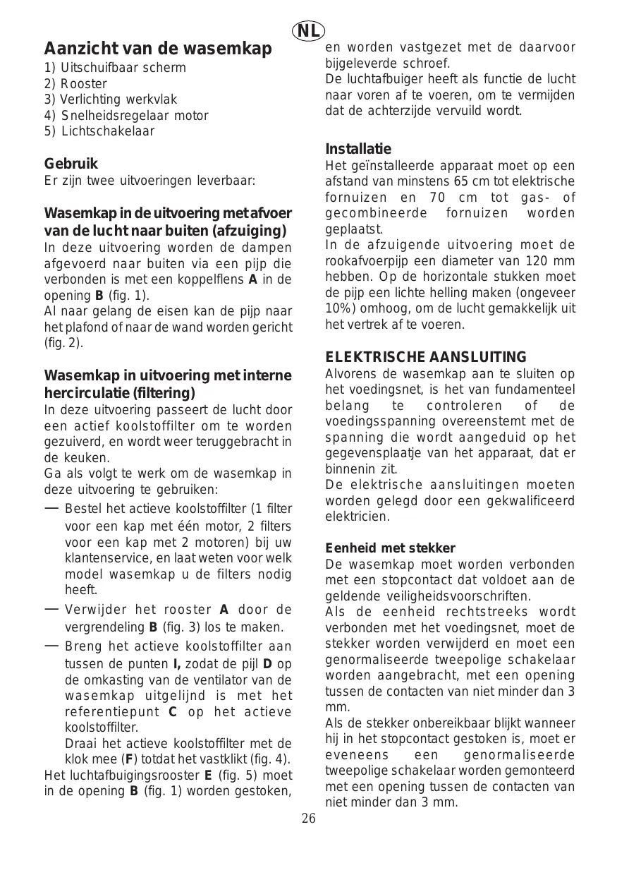voedingsspanning overeenstemt met de spanning die wordt aangeduid op het gegevensplaatje van het apparaat, dat er binnenin zit. De elektrische aansluitingen moeten worden gelegd door een gekwalificeerd elektricien. Wasemkap in uitvoering met interne hercirculatie (filtering) In deze uitvoering passeert de lucht door een actief koolstoffilter om te worden gezuiverd, en wordt weer teruggebracht in de keuken. Ga als volgt te werk om de wasemkap in deze uitvoering te gebruiken: — Bestel het actieve koolstoffilter (1 filter voor een kap met één motor, 2 filters voor een kap met 2 motoren) bij uw klantenservice, en laat weten voor welk model wasemkap u de filters nodig heeft. — Verwijder het rooster A door de vergrendeling B (fig. 3) los te maken. — Breng het actieve koolstoffilter aan tussen de punten I, zodat de pijl D op de omkasting van de ventilator van de wasemkap uitgelijnd is met het referentiepunt C op het actieve koolstoffilter. Draai het actieve koolstoffilter met de klok mee (F) totdat het vastklikt (fig. 4). Het luchtafbuigingsrooster E (fig. 5) moet in de opening B (fig. 1) worden gestoken, Eenheid met stekker De wasemkap moet worden verbonden met een stopcontact dat voldoet aan de geldende veiligheidsvoorschriften. Als de eenheid rechtstreeks wordt verbonden met het voedingsnet, moet de stekker worden verwijderd en moet een genormaliseerde tweepolige schakelaar worden aangebracht, met een opening tussen de contacten van niet minder dan 3 mm. Als de stekker onbereikbaar blijkt wanneer hij in het stopcontact gestoken is, moet er eveneens een genormaliseerde tweepolige schakelaar worden gemonteerd met een opening tussen de contacten van niet minder dan 3 mm.